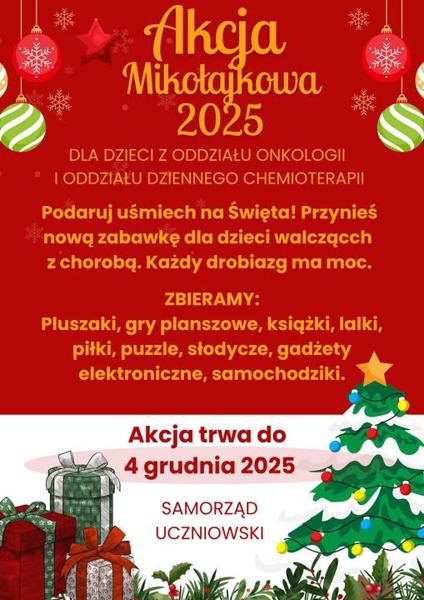 Samorząd Uczniowski zaprasza do włączenia się w Akcję Mikołajkową 2025 dla dzieci z oddzialu onkologii i oddzialu...