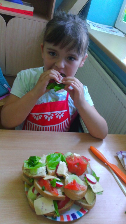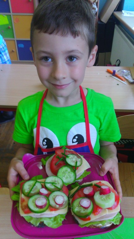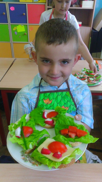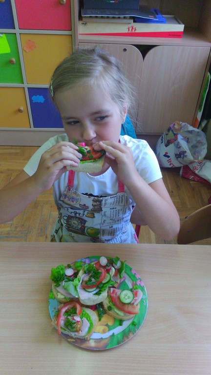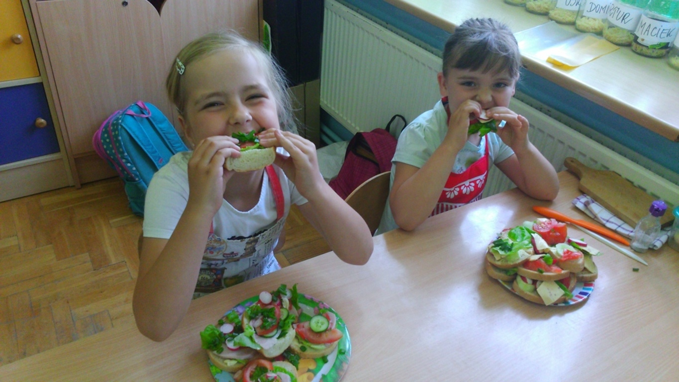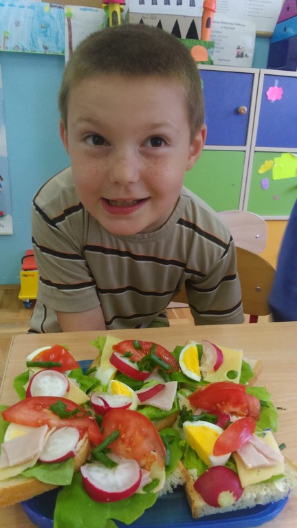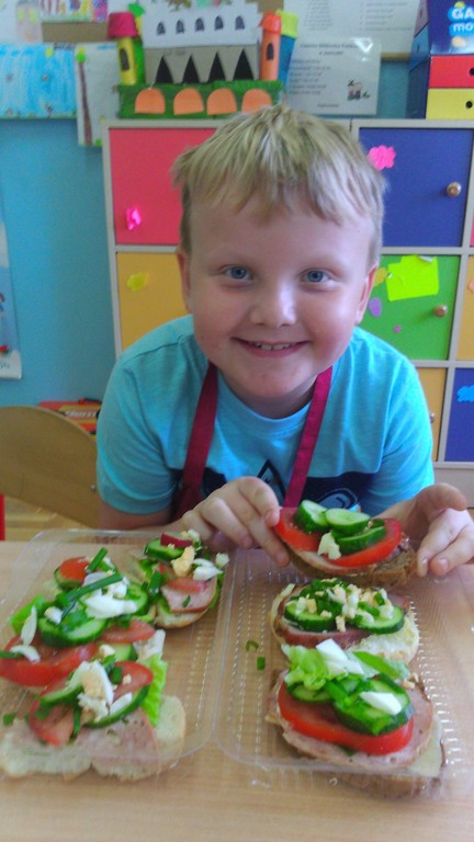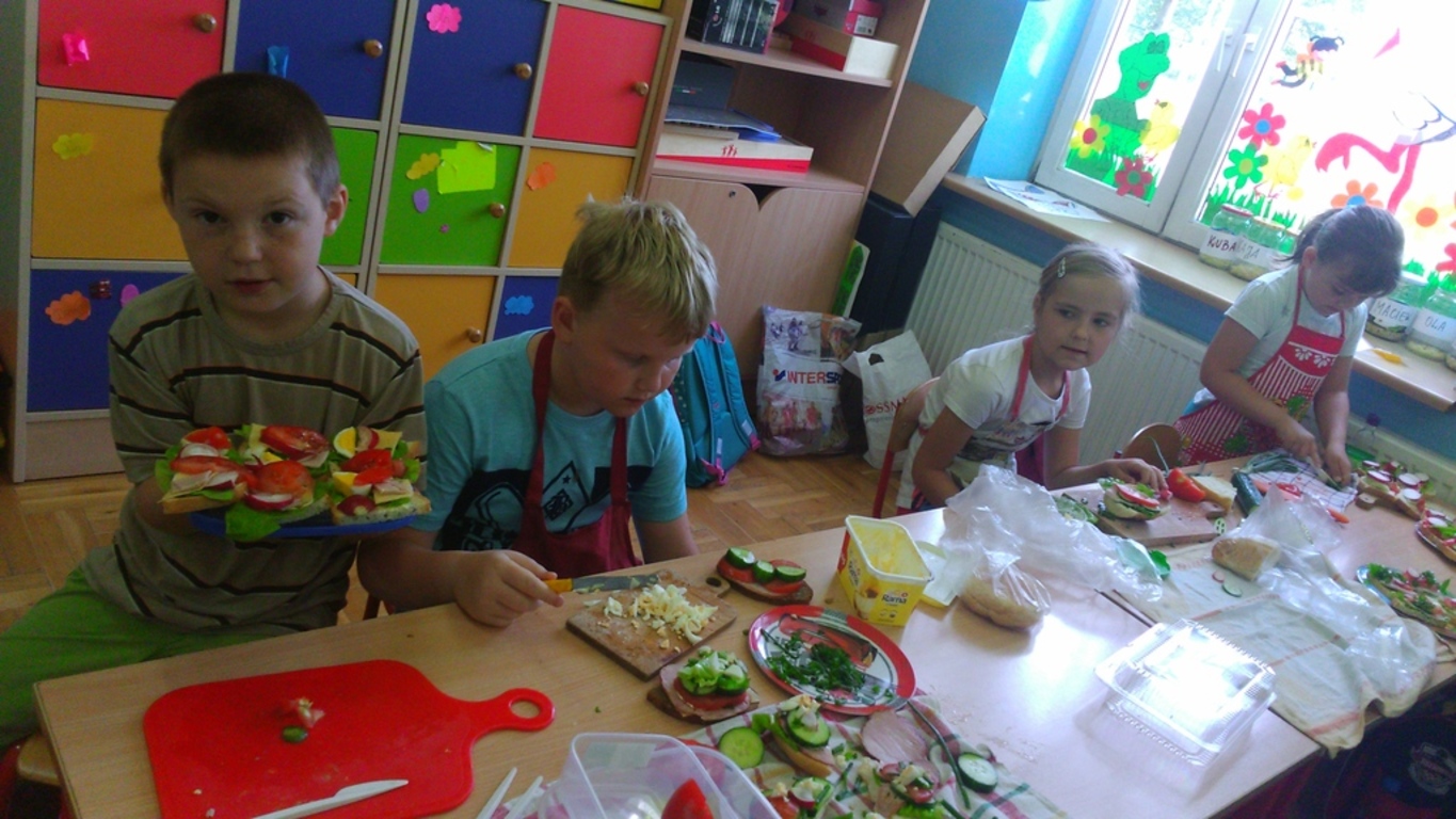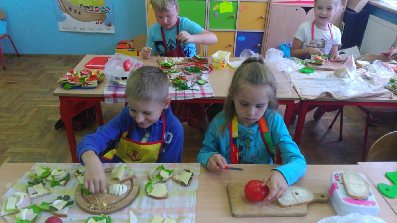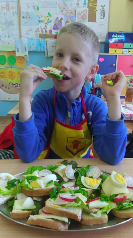 W dniu 3 maja 2016r uczniowie klasy 1 omawiali zagadnienia dotyczące zdrowego odżywiania. Efektem omawianych zajęć było samodzielne wykonanie przez pierwszaków smacznych, zdrowych i kolorowych kanapek. Już samo przygotowanie posiłku okazało się dla dzieci kulinarną przygodą. Dbając o to, by drugie śniadanie było pożywne, pierwszaki z wielkim zapałem zabrały się do przygotowania zdrowych kanapek. W klasie unosił się wspaniały zapach, któremu trudno było się oprzeć, już w trakcie przygotowania dzieci podjadały swoje smakowitości. Właściwy dobór barwnych składników oraz kanapkowe kompozycje sprawiły, że wyglądały one wyjątkowo kolorowo. Pewnie dlatego, wszyscy zjadali je z wielkim apetytem.