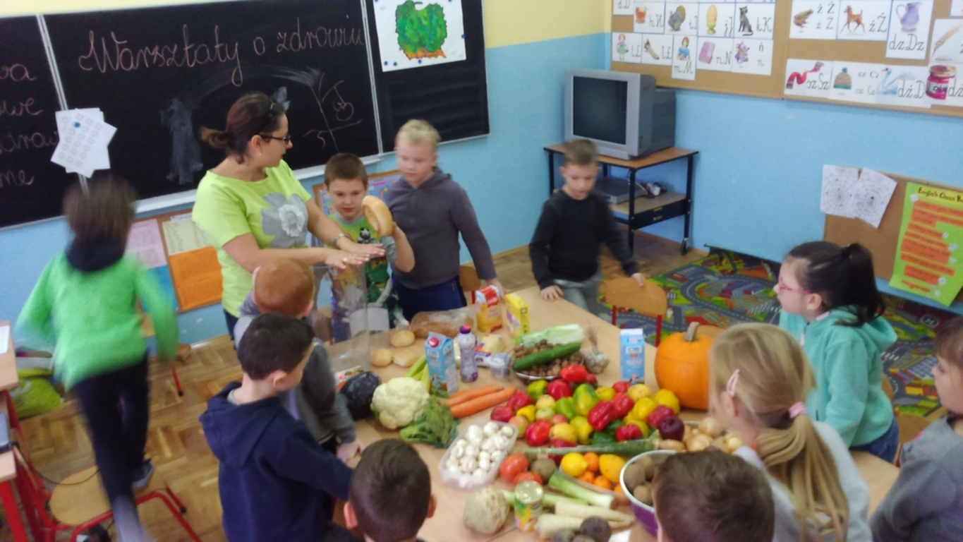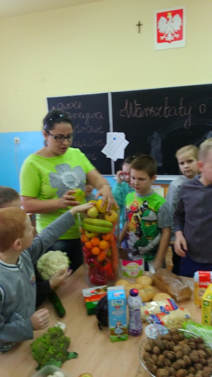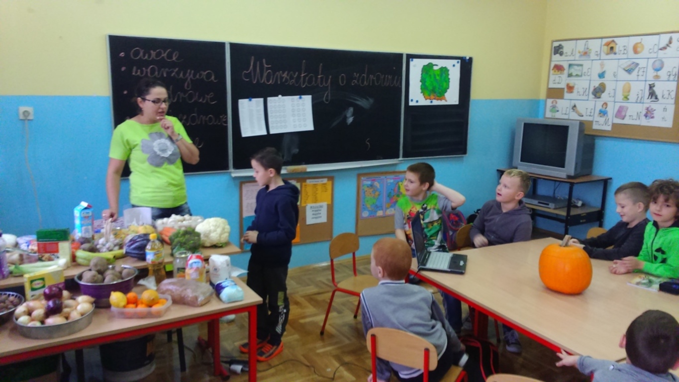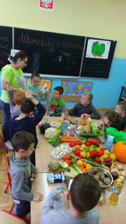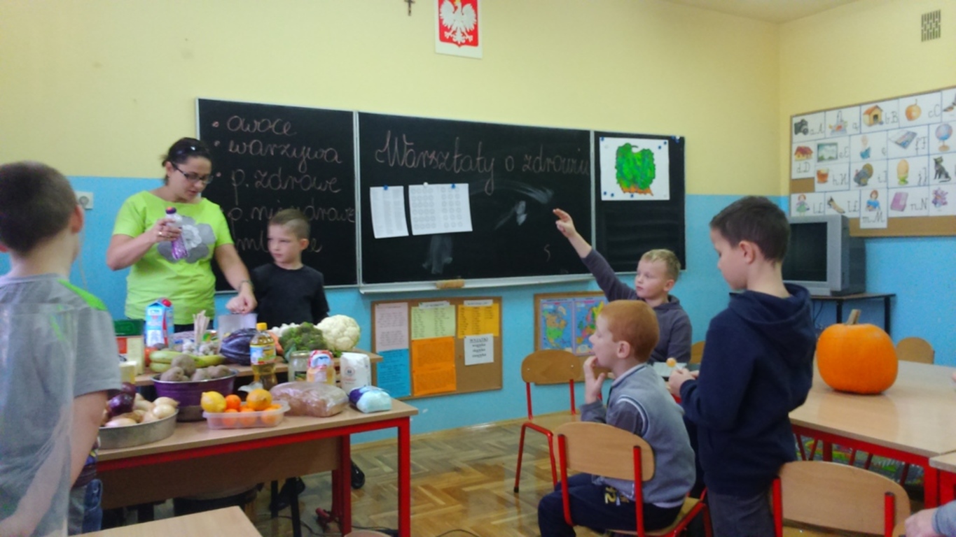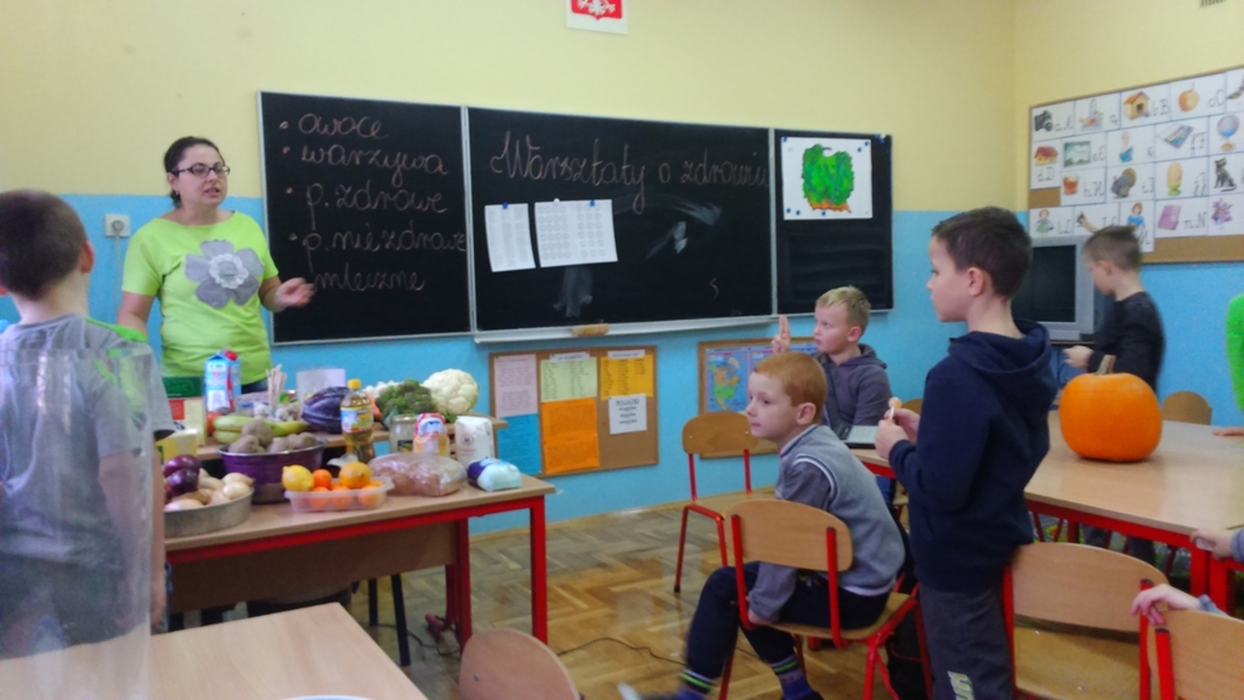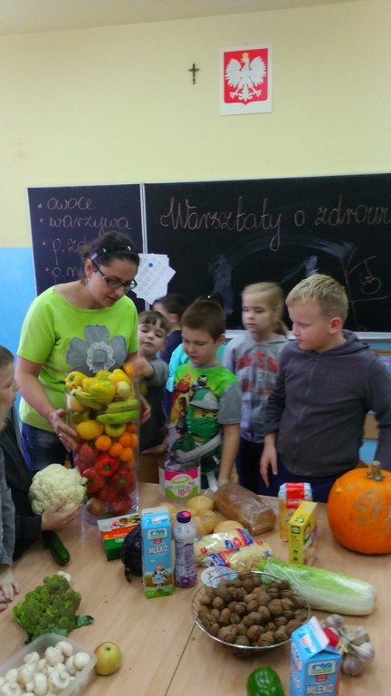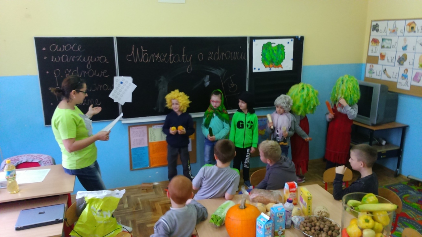 W dniu 30 października uczniowie klas I i II wzięli udział w „Warsztatach o zdrowiu”. Warsztaty przeprowadziła Pani Katarzyna Rajkowska – szkolny koordynator promocji zdrowia. Podczas dwugodzinnych warsztatów uczniowie mieli okazję poznać zasady prawidłowego odżywiania, sprawdzić swoją wiedzę na temat spożywania warzyw, owoców, przetworów mlecznych, białkowych, węglowodanów, tłuszczy i napojów. Dzieci poznawały warzywa i owoce po dotyku i smaku, a ponadto z naturalnych rekwizytów wykonały bezbłędnie piramidę żywienia. Poza degustacją zdrowych artykułów spożywczych samodzielnie wyrzucały produkty niezdrowe, a ze zdrowych tworzyły kolorowy dzban. Uczniom bardzo podobały się zabawy teatralne i muzyczne. Z wykorzystaniem barwnych strojów oraz wierszy o warzywach i owocach odgrywały scenki dramowe, a z użyciem instrumentów muzycznych wykonanych z kapsli i drewnianych łyżek, zagrali warzywną partyturę oraz odtańczyli owocowy taniec. W nagrodę wszyscy mogli wybrać sobie dowolne warzywo lub owoc.