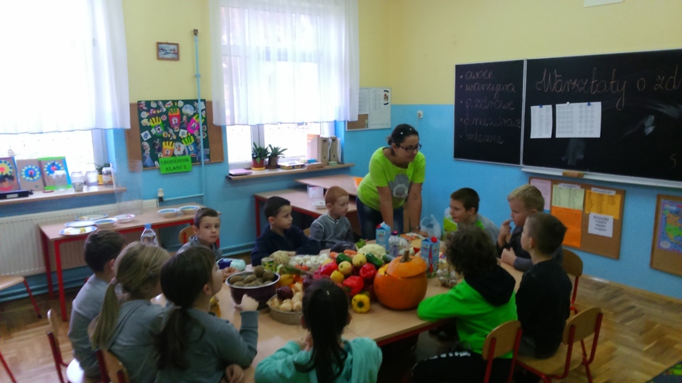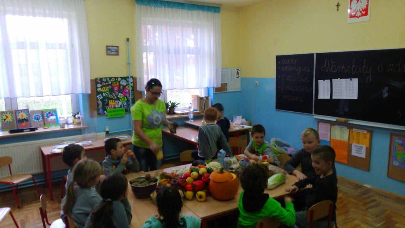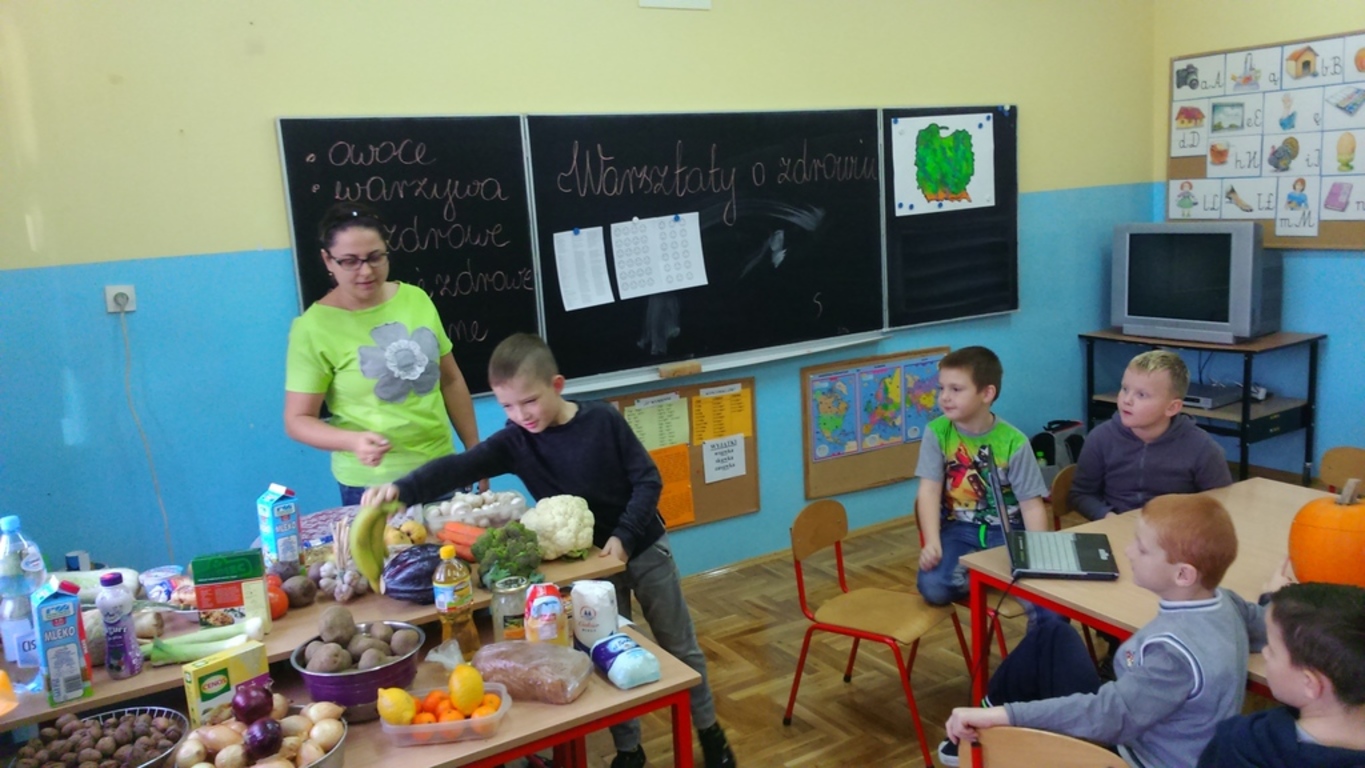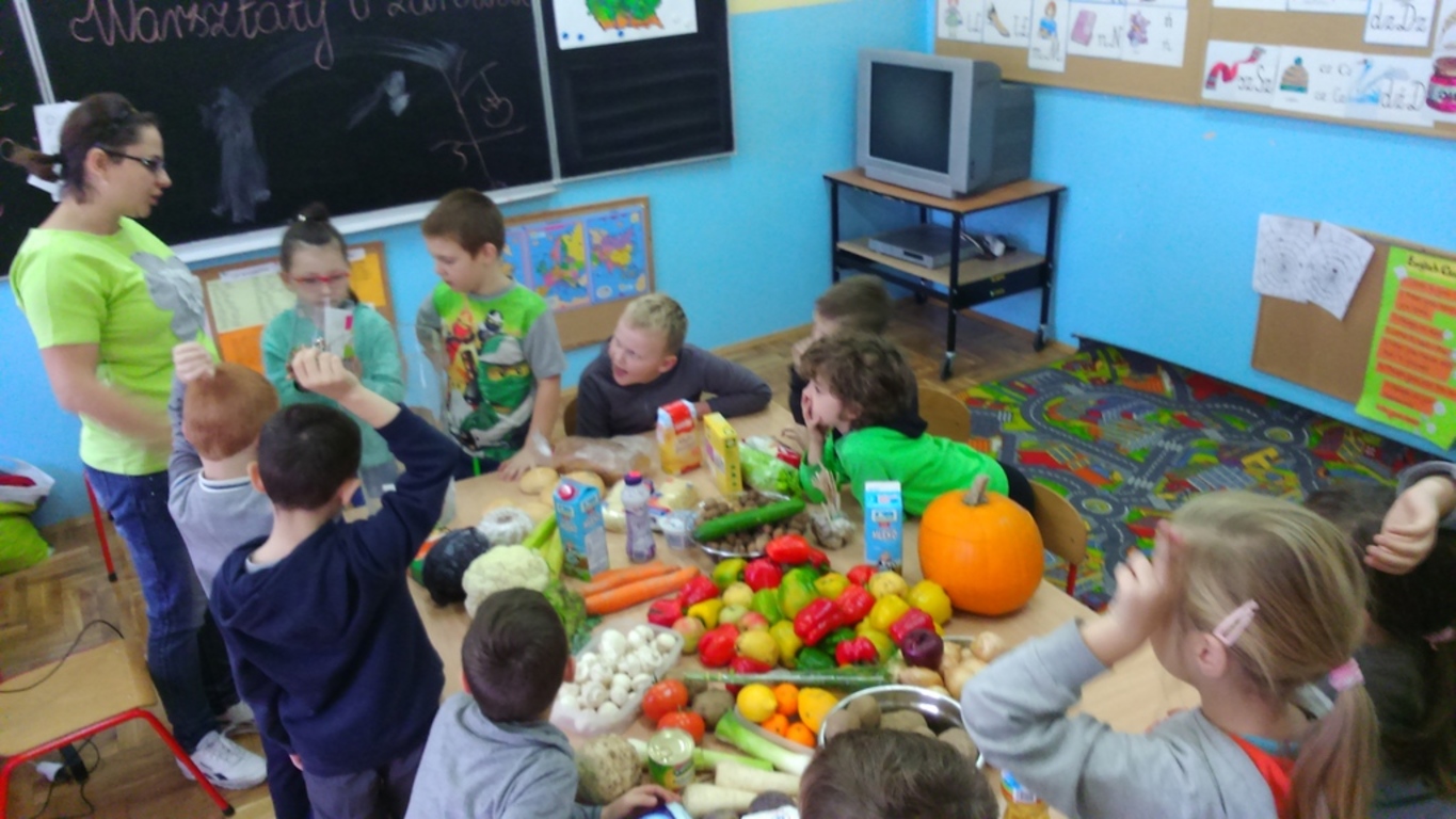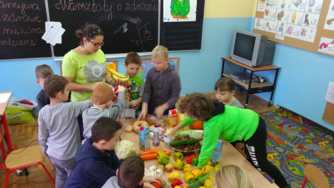 W dniu 30 października uczniowie klas I i II wzięli udział w „Warsztatach o zdrowiu”. Warsztaty przeprowadziła Pani Katarzyna Rajkowska – szkolny koordynator promocji zdrowia. Podczas dwugodzinnych warsztatów uczniowie mieli okazję poznać zasady prawidłowego odżywiania, sprawdzić swoją wiedzę na temat spożywania warzyw, owoców, przetworów mlecznych, białkowych, węglowodanów, tłuszczy i napojów. Dzieci poznawały warzywa i owoce po dotyku i smaku, a ponadto z naturalnych rekwizytów wykonały bezbłędnie piramidę żywienia. Poza degustacją zdrowych artykułów spożywczych samodzielnie wyrzucały produkty niezdrowe, a ze zdrowych tworzyły kolorowy dzban. Uczniom bardzo podobały się zabawy teatralne i muzyczne. Z wykorzystaniem barwnych strojów oraz wierszy o warzywach i owocach odgrywały scenki dramowe, a z użyciem instrumentów muzycznych wykonanych z kapsli i drewnianych łyżek, zagrali warzywną partyturę oraz odtańczyli owocowy taniec. W nagrodę wszyscy mogli wybrać sobie dowolne warzywo lub owoc.