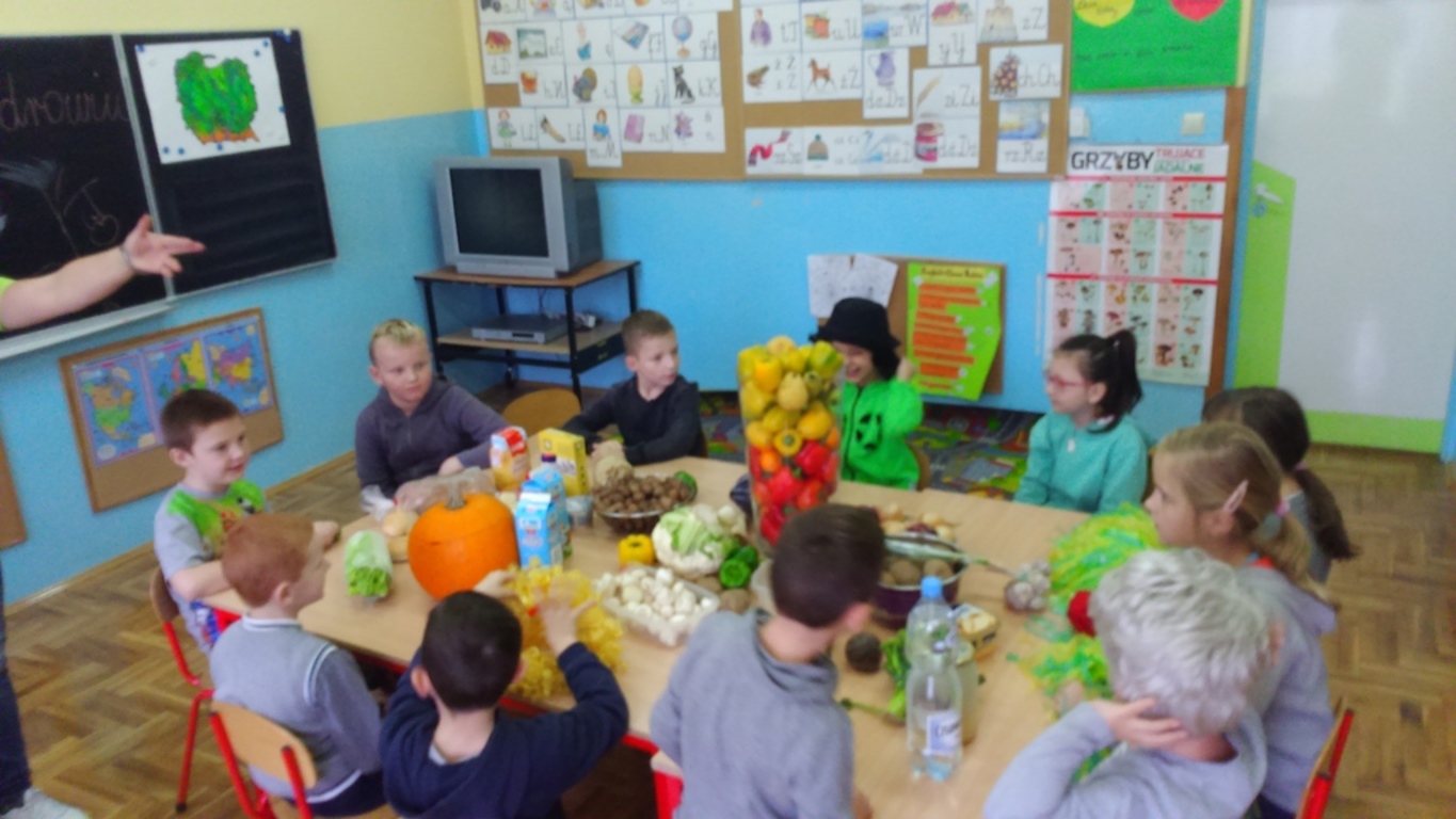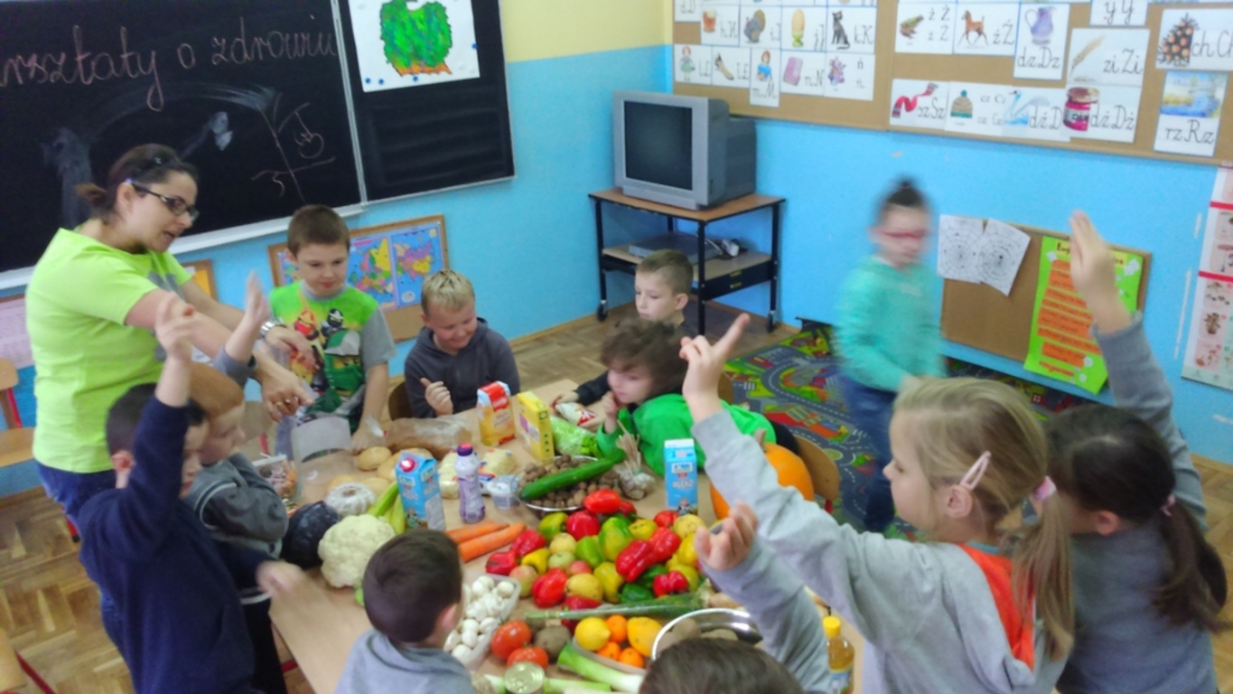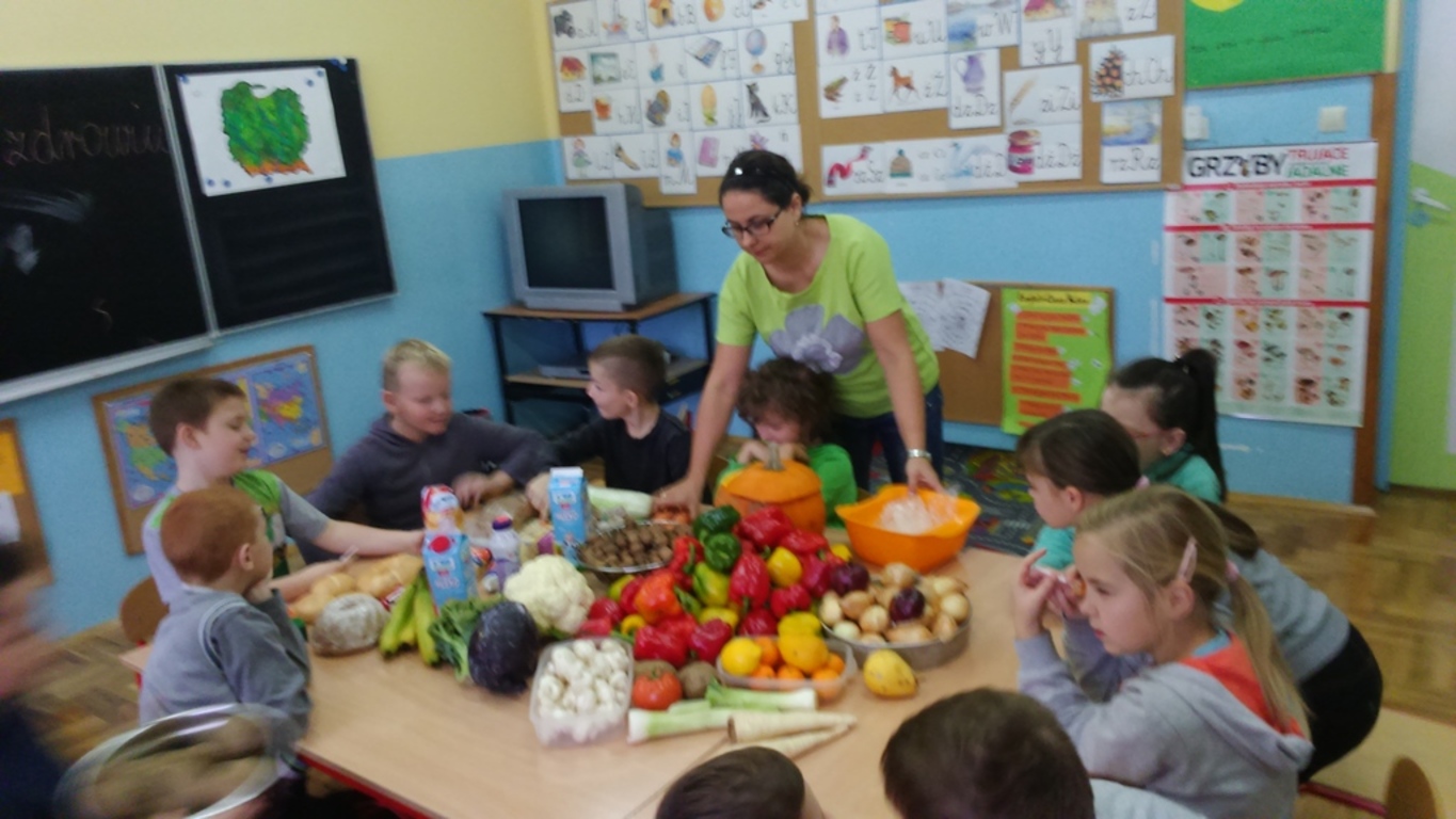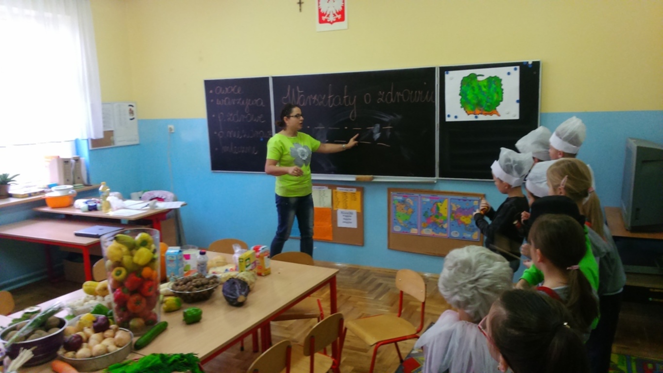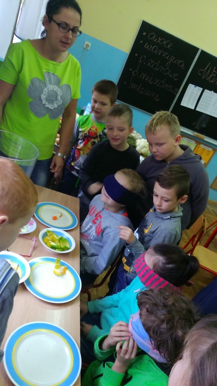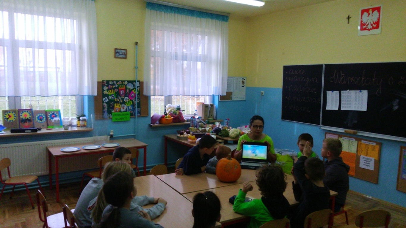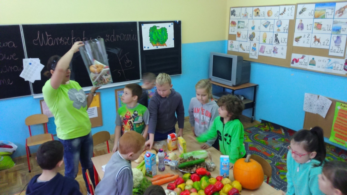 W dniu 30 października uczniowie klas I i II wzięli udział w „Warsztatach o zdrowiu”. Warsztaty przeprowadziła Pani Katarzyna Rajkowska – szkolny koordynator promocji zdrowia. Podczas dwugodzinnych warsztatów uczniowie mieli okazję poznać zasady prawidłowego odżywiania, sprawdzić swoją wiedzę na temat spożywania warzyw, owoców, przetworów mlecznych, białkowych, węglowodanów, tłuszczy i napojów. Dzieci poznawały warzywa i owoce po dotyku i smaku, a ponadto z naturalnych rekwizytów wykonały bezbłędnie piramidę żywienia. Poza degustacją zdrowych artykułów spożywczych samodzielnie wyrzucały produkty niezdrowe, a ze zdrowych tworzyły kolorowy dzban. Uczniom bardzo podobały się zabawy teatralne i muzyczne. Z wykorzystaniem barwnych strojów oraz wierszy o warzywach i owocach odgrywały scenki dramowe, a z użyciem instrumentów muzycznych wykonanych z kapsli i drewnianych łyżek, zagrali warzywną partyturę oraz odtańczyli owocowy taniec. W nagrodę wszyscy mogli wybrać sobie dowolne warzywo lub owoc.