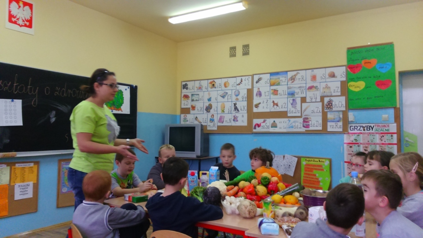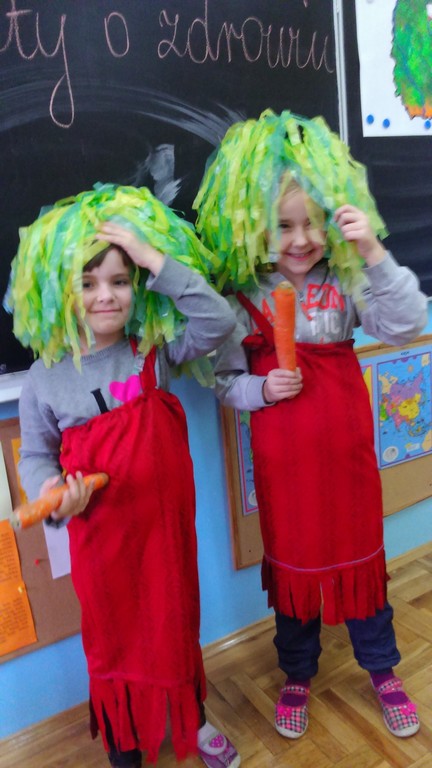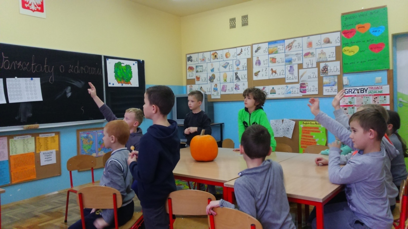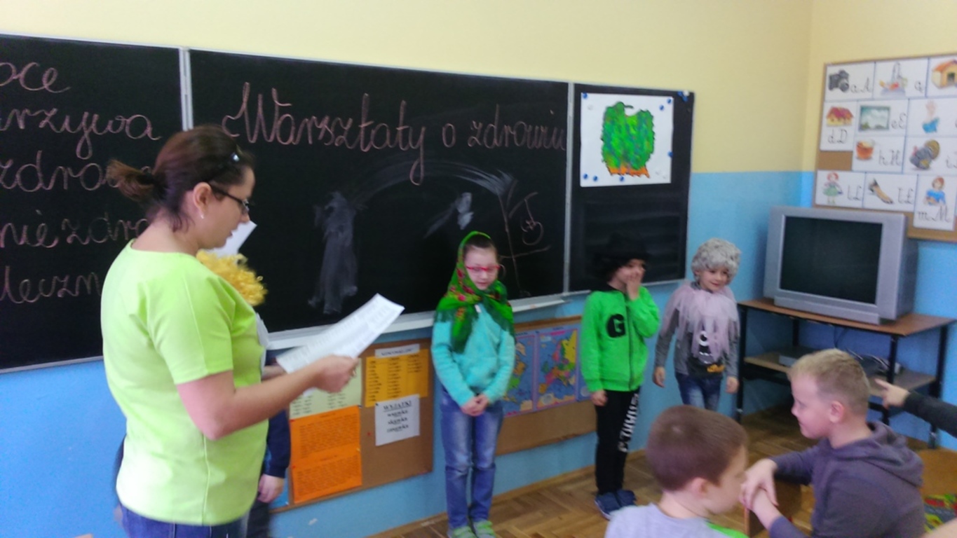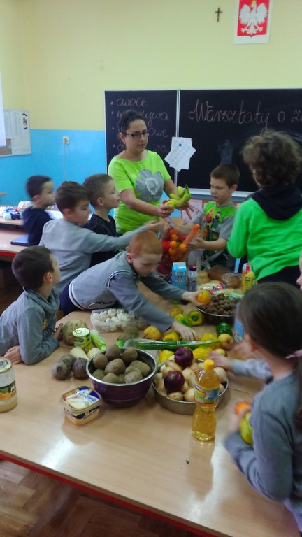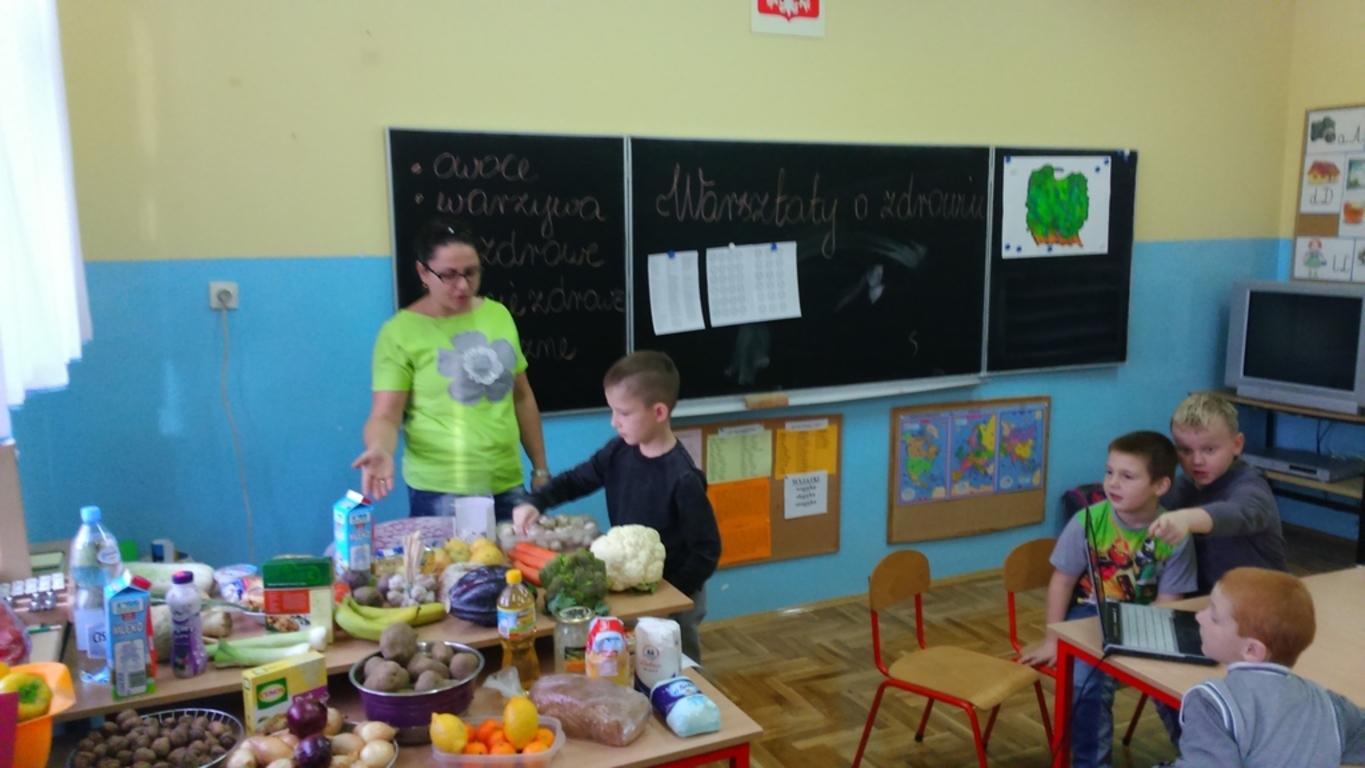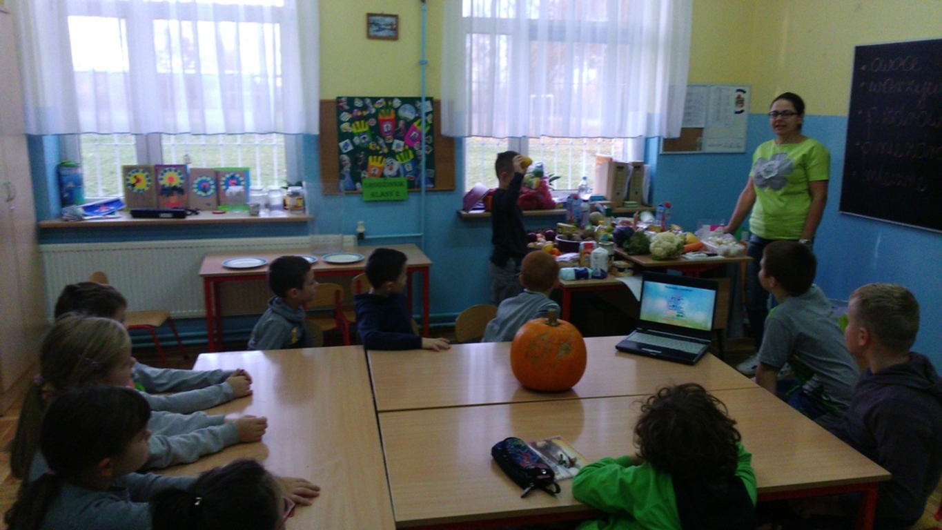 W dniu 30 października uczniowie klas I i II wzięli udział w „Warsztatach o zdrowiu”. Warsztaty przeprowadziła Pani Katarzyna Rajkowska – szkolny koordynator promocji zdrowia. Podczas dwugodzinnych warsztatów uczniowie mieli okazję poznać zasady prawidłowego odżywiania, sprawdzić swoją wiedzę na temat spożywania warzyw, owoców, przetworów mlecznych, białkowych, węglowodanów, tłuszczy i napojów. Dzieci poznawały warzywa i owoce po dotyku i smaku, a ponadto z naturalnych rekwizytów wykonały bezbłędnie piramidę żywienia. Poza degustacją zdrowych artykułów spożywczych samodzielnie wyrzucały produkty niezdrowe, a ze zdrowych tworzyły kolorowy dzban. Uczniom bardzo podobały się zabawy teatralne i muzyczne. Z wykorzystaniem barwnych strojów oraz wierszy o warzywach i owocach odgrywały scenki dramowe, a z użyciem instrumentów muzycznych wykonanych z kapsli i drewnianych łyżek, zagrali warzywną partyturę oraz odtańczyli owocowy taniec. W nagrodę wszyscy mogli wybrać sobie dowolne warzywo lub owoc.