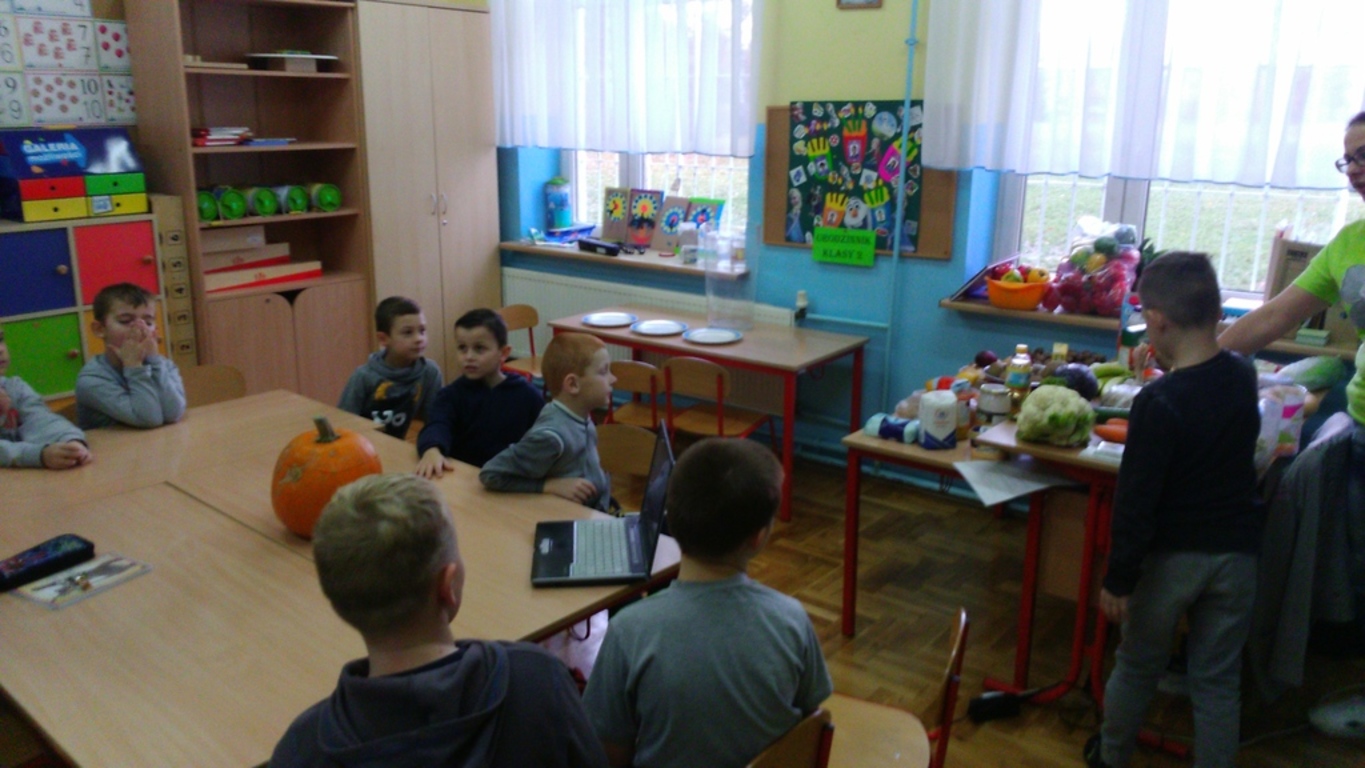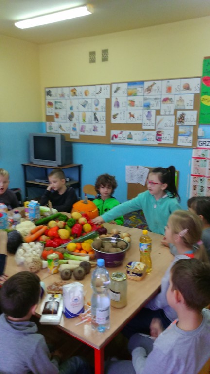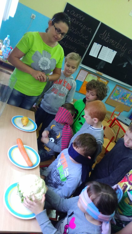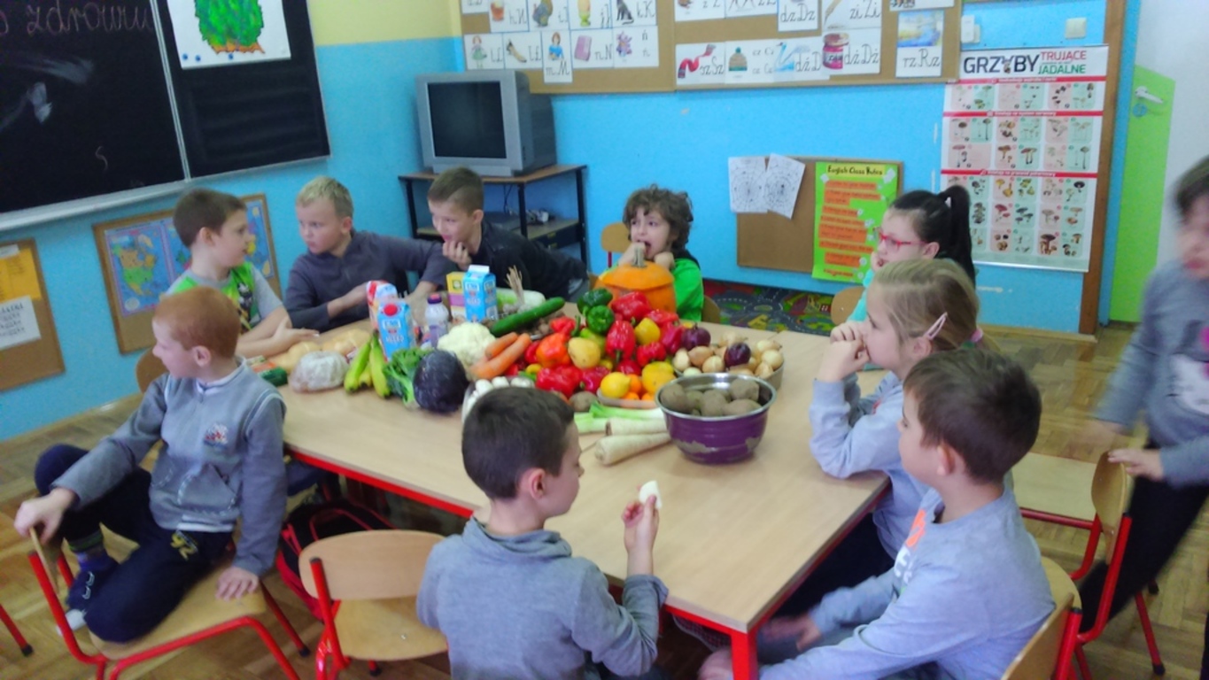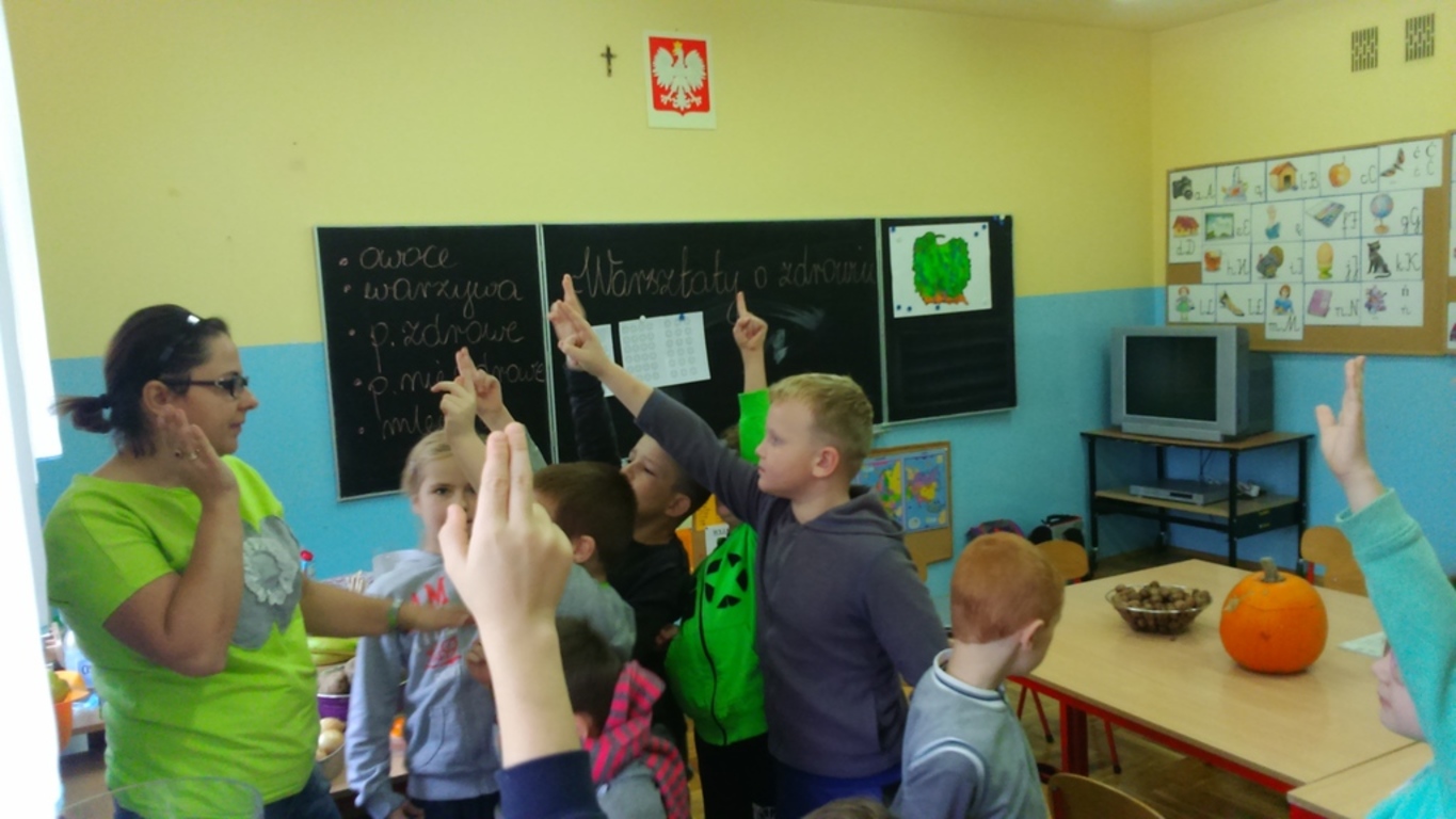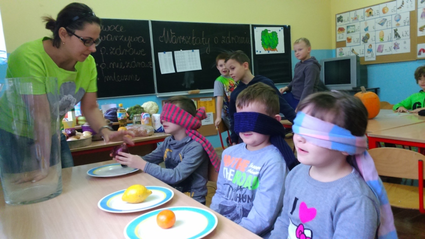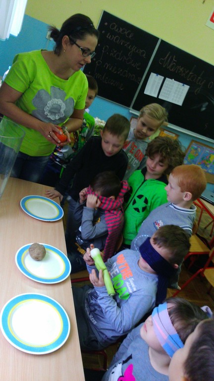 W dniu 30 października uczniowie klas I i II wzięli udział w „Warsztatach o zdrowiu”. Warsztaty przeprowadziła Pani Katarzyna Rajkowska – szkolny koordynator promocji zdrowia. Podczas dwugodzinnych warsztatów uczniowie mieli okazję poznać zasady prawidłowego odżywiania, sprawdzić swoją wiedzę na temat spożywania warzyw, owoców, przetworów mlecznych, białkowych, węglowodanów, tłuszczy i napojów. Dzieci poznawały warzywa i owoce po dotyku i smaku, a ponadto z naturalnych rekwizytów wykonały bezbłędnie piramidę żywienia. Poza degustacją zdrowych artykułów spożywczych samodzielnie wyrzucały produkty niezdrowe, a ze zdrowych tworzyły kolorowy dzban. Uczniom bardzo podobały się zabawy teatralne i muzyczne. Z wykorzystaniem barwnych strojów oraz wierszy o warzywach i owocach odgrywały scenki dramowe, a z użyciem instrumentów muzycznych wykonanych z kapsli i drewnianych łyżek, zagrali warzywną partyturę oraz odtańczyli owocowy taniec. W nagrodę wszyscy mogli wybrać sobie dowolne warzywo lub owoc.