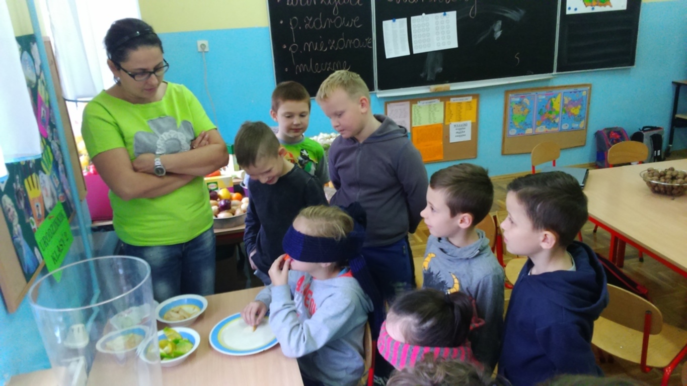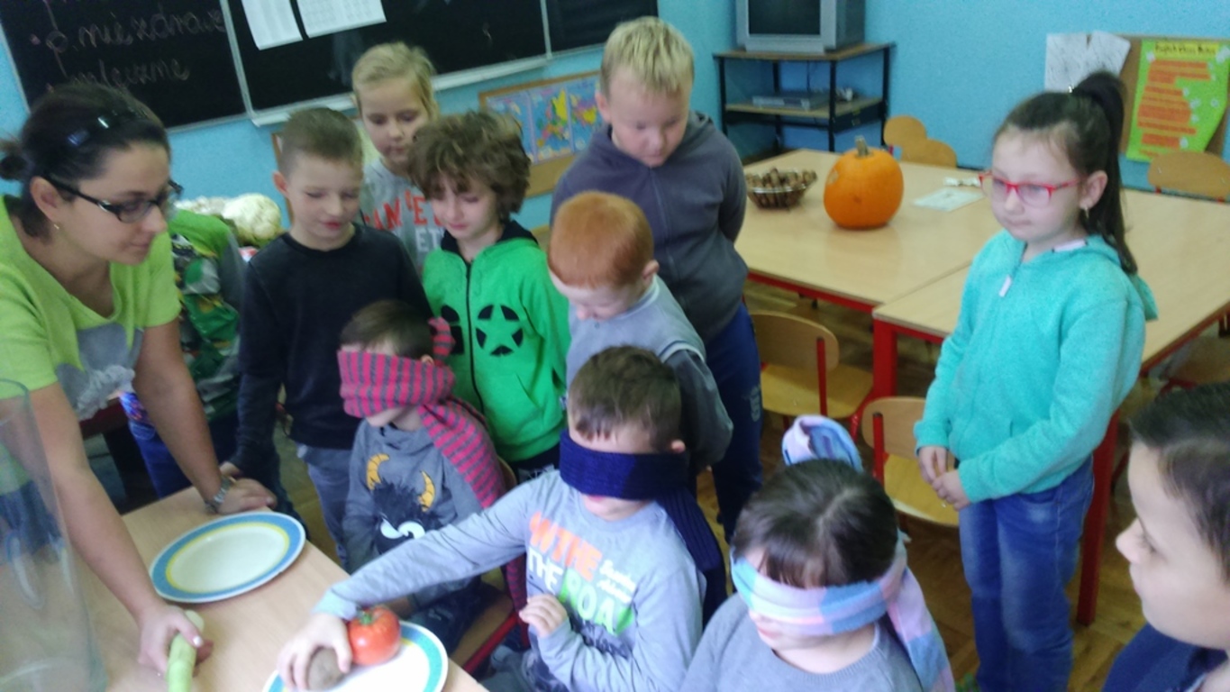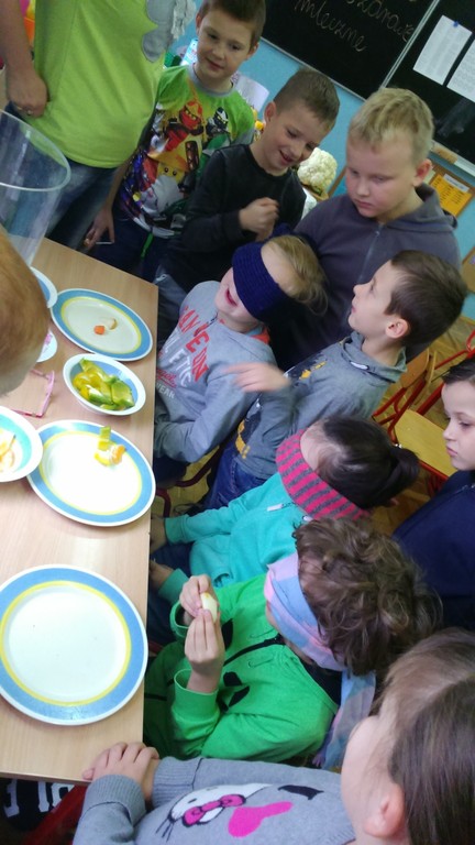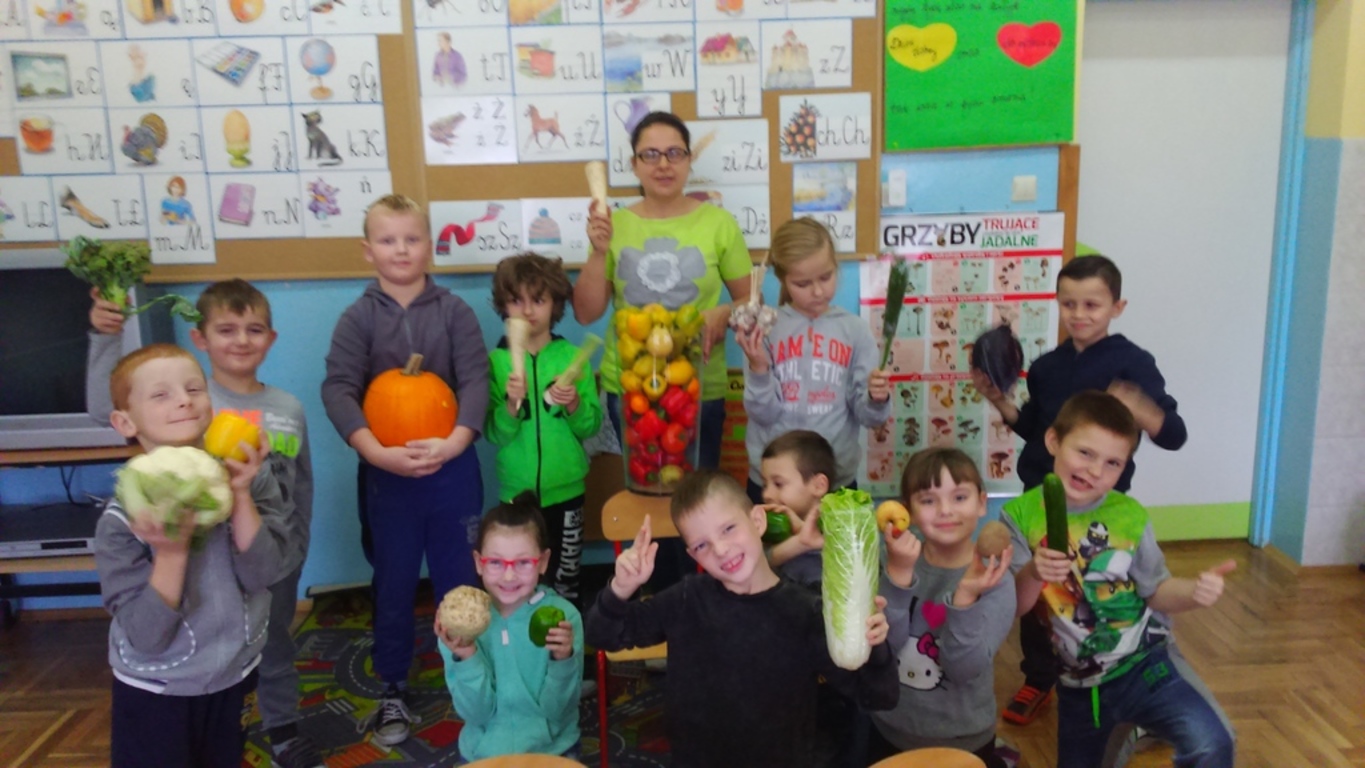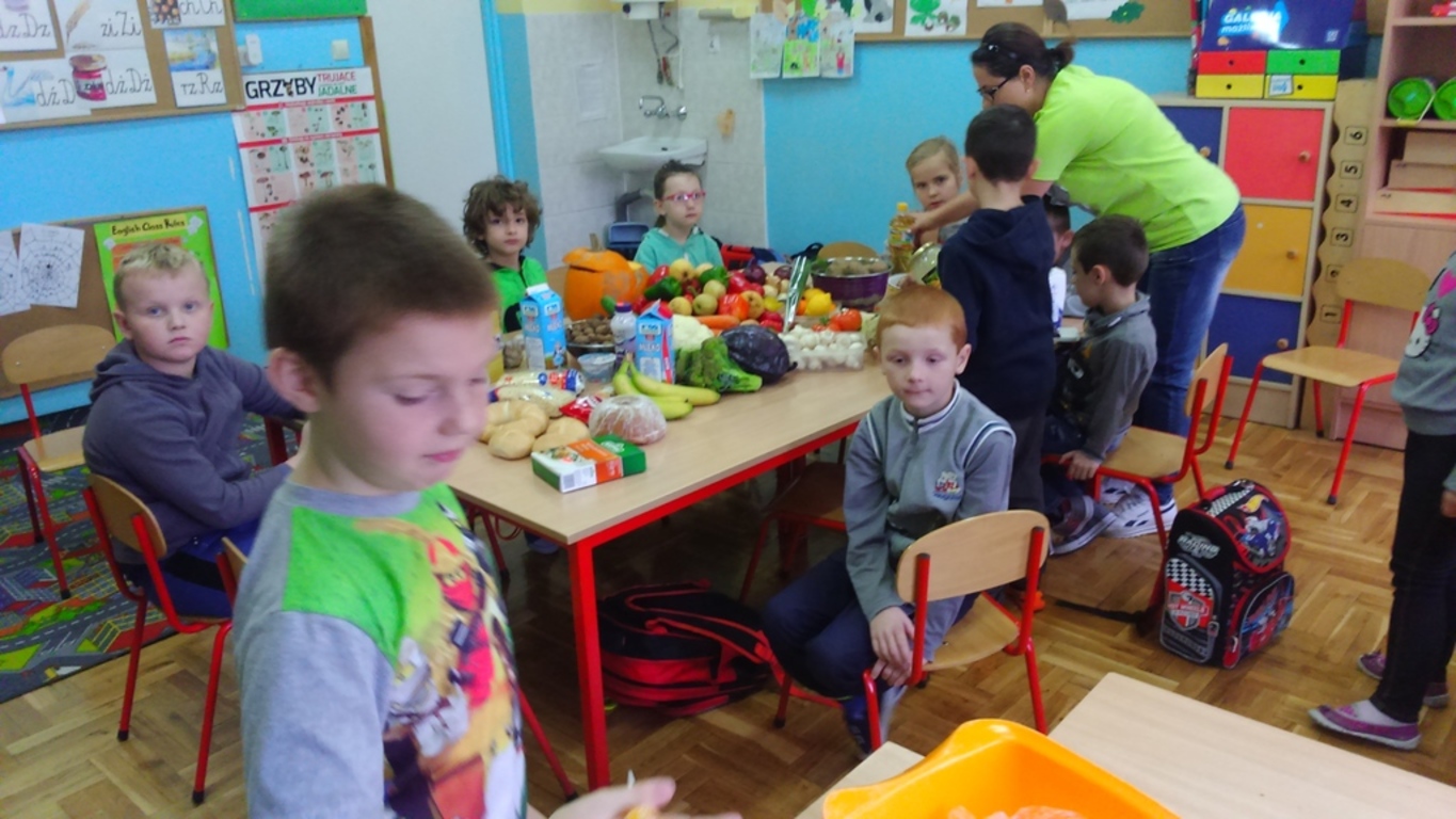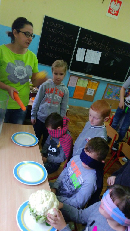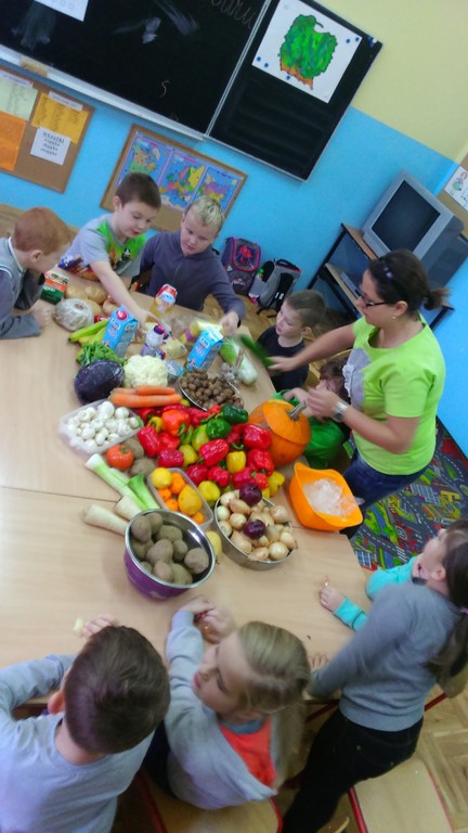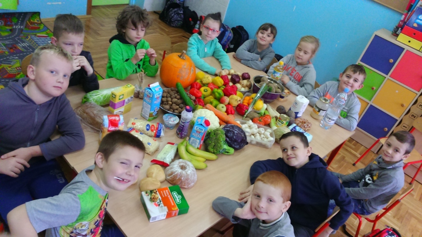 W dniu 30 października uczniowie klas I i II wzięli udział w „Warsztatach o zdrowiu”. Warsztaty przeprowadziła Pani Katarzyna Rajkowska – szkolny koordynator promocji zdrowia. Podczas dwugodzinnych warsztatów uczniowie mieli okazję poznać zasady prawidłowego odżywiania, sprawdzić swoją wiedzę na temat spożywania warzyw, owoców, przetworów mlecznych, białkowych, węglowodanów, tłuszczy i napojów. Dzieci poznawały warzywa i owoce po dotyku i smaku, a ponadto z naturalnych rekwizytów wykonały bezbłędnie piramidę żywienia. Poza degustacją zdrowych artykułów spożywczych samodzielnie wyrzucały produkty niezdrowe, a ze zdrowych tworzyły kolorowy dzban. Uczniom bardzo podobały się zabawy teatralne i muzyczne. Z wykorzystaniem barwnych strojów oraz wierszy o warzywach i owocach odgrywały scenki dramowe, a z użyciem instrumentów muzycznych wykonanych z kapsli i drewnianych łyżek, zagrali warzywną partyturę oraz odtańczyli owocowy taniec. W nagrodę wszyscy mogli wybrać sobie dowolne warzywo lub owoc.