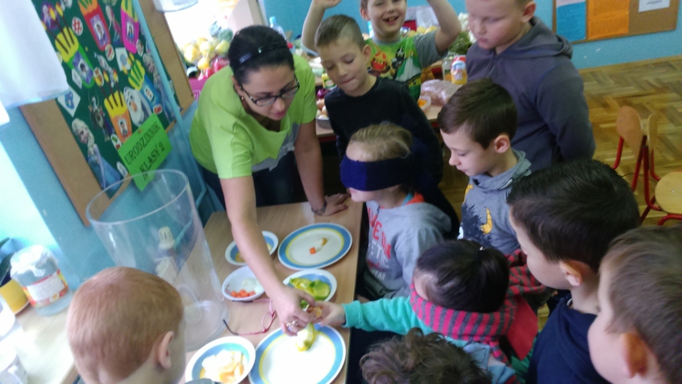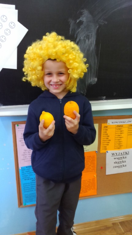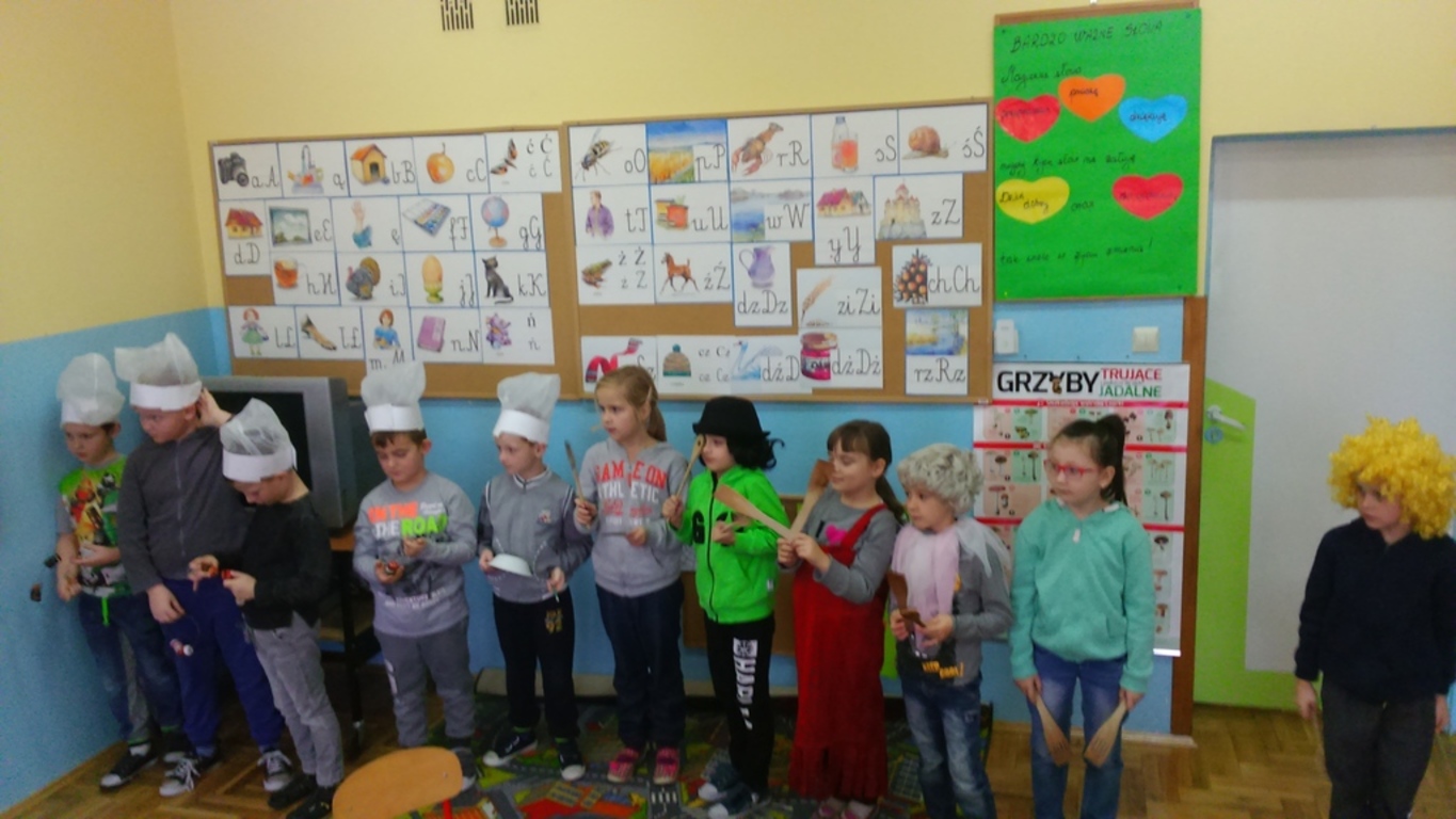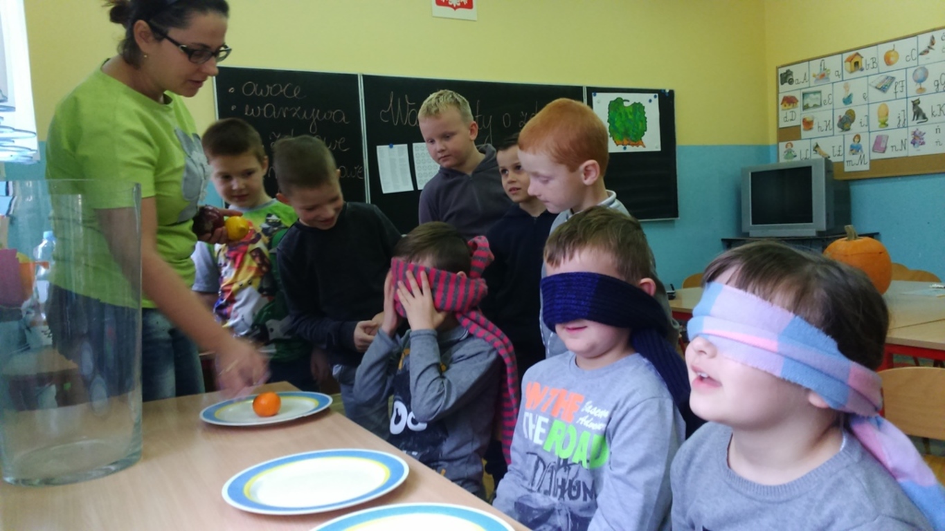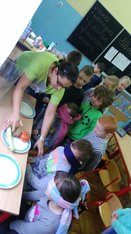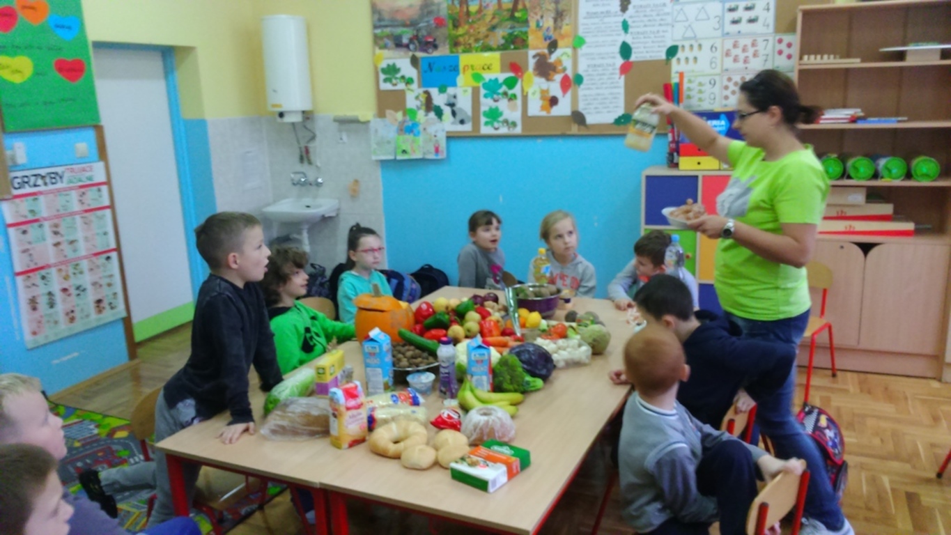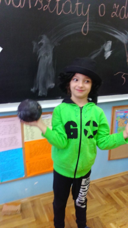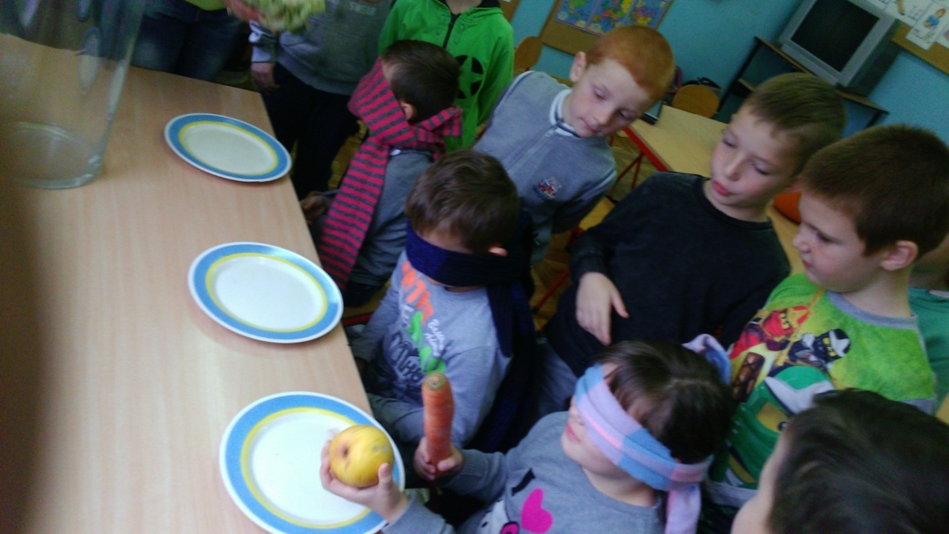 W dniu 30 października uczniowie klas I i II wzięli udział w „Warsztatach o zdrowiu”. Warsztaty przeprowadziła Pani Katarzyna Rajkowska – szkolny koordynator promocji zdrowia. Podczas dwugodzinnych warsztatów uczniowie mieli okazję poznać zasady prawidłowego odżywiania, sprawdzić swoją wiedzę na temat spożywania warzyw, owoców, przetworów mlecznych, białkowych, węglowodanów, tłuszczy i napojów. Dzieci poznawały warzywa i owoce po dotyku i smaku, a ponadto z naturalnych rekwizytów wykonały bezbłędnie piramidę żywienia. Poza degustacją zdrowych artykułów spożywczych samodzielnie wyrzucały produkty niezdrowe, a ze zdrowych tworzyły kolorowy dzban. Uczniom bardzo podobały się zabawy teatralne i muzyczne. Z wykorzystaniem barwnych strojów oraz wierszy o warzywach i owocach odgrywały scenki dramowe, a z użyciem instrumentów muzycznych wykonanych z kapsli i drewnianych łyżek, zagrali warzywną partyturę oraz odtańczyli owocowy taniec. W nagrodę wszyscy mogli wybrać sobie dowolne warzywo lub owoc.