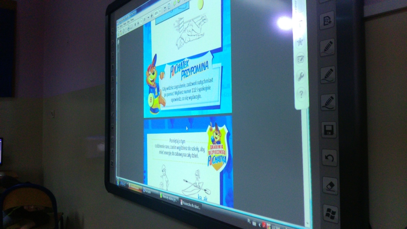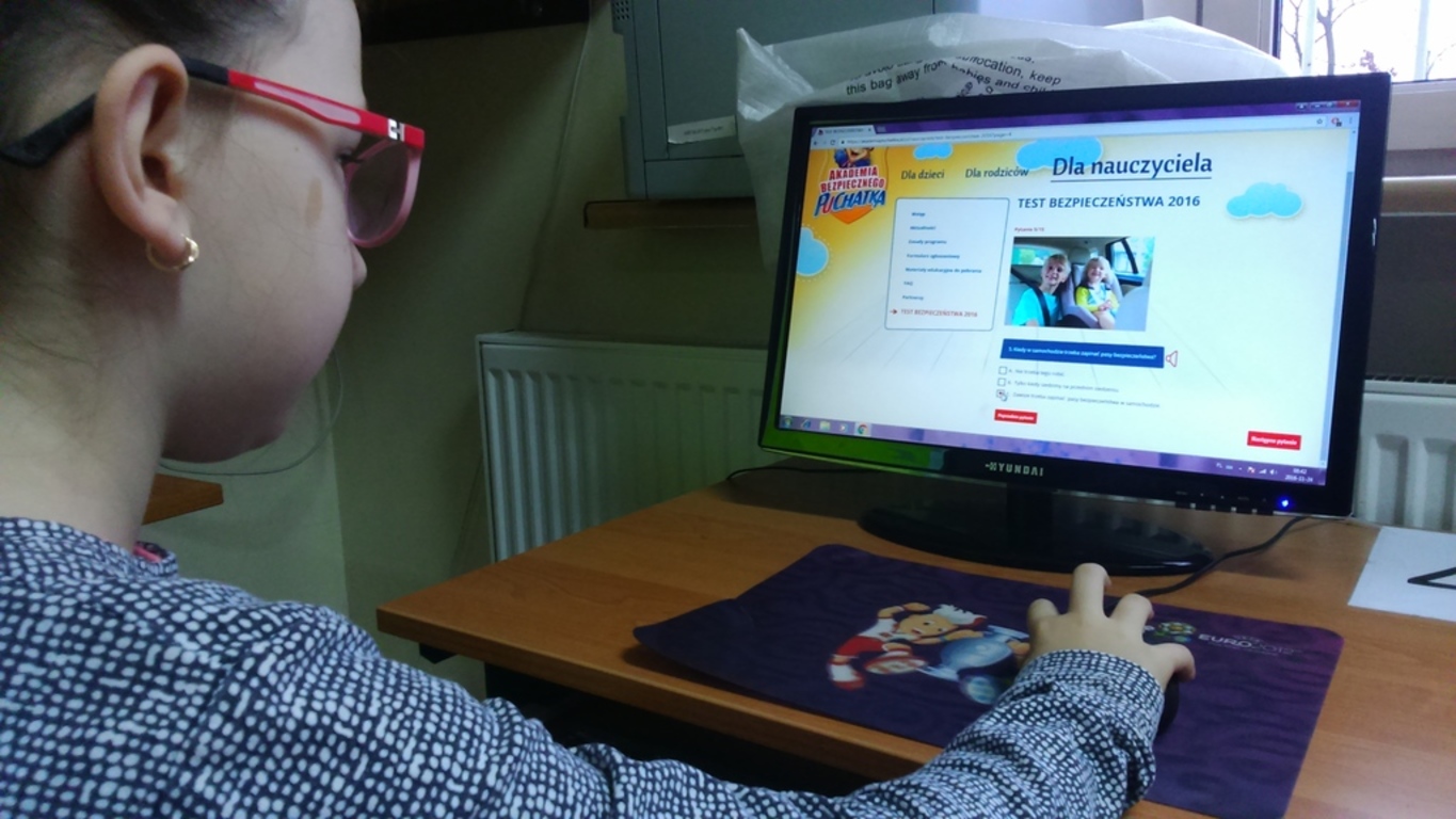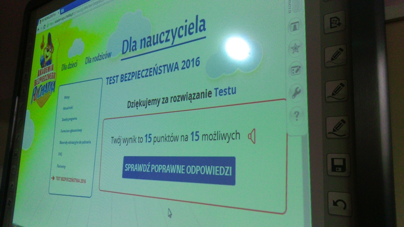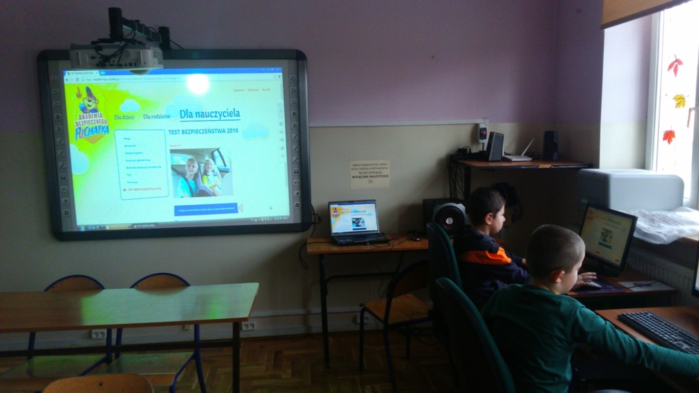 W ramach programu „Akademia Bezpiecznego Puchatka” dzieci z klas I-III nauczyły się jak żyć bezpiecznie. Uczniowie otrzymali specjalne książeczki, które pomogły im utrwalić wiedzę o zasadach ruchu drogowego, o tym jak unikać zagrożeń i jak bezpiecznie spędzać czas wolny w domu, w szkole i w czasie zabawy. Dzieci z klas I-III wzięły udział pogadance tematycznej, a na koniec samodzielnie wypełniły Ogólnopolski Test Wiedzy o Bezpieczeństwie. Test obejmował 15 pytań w takich aspektach jak: bezpieczeństwo w domu, w szkole, w drodze do szkoły oraz bezpieczeństwo w Internecie. Do każdego pytania podane były trzy warianty odpowiedzi, z których tylko jedna była prawidłowa. Dzieci doskonale poradziły sobie zarówno z obsługą testu jak i odpowiedziami. Dzięki niemu utrwaliły wiedzę na temat bezpiecznych zachowań, a po udziale w internetowym teście zdobyły Certyfikat Akademii Bezpiecznego Puchatka.