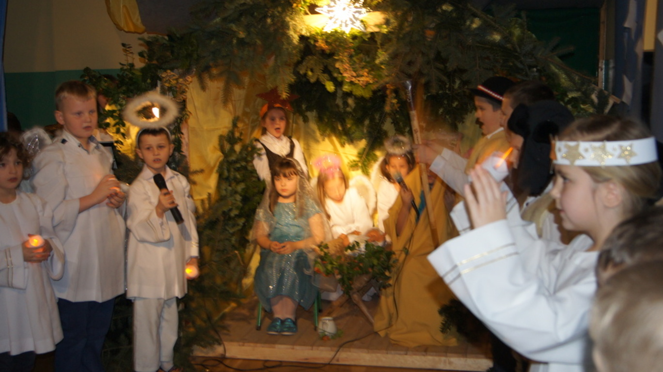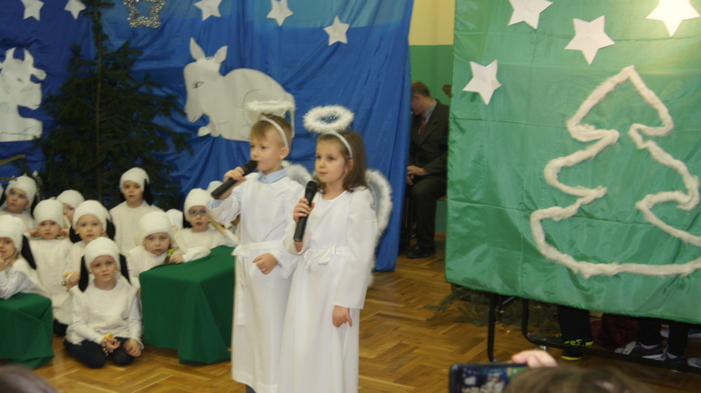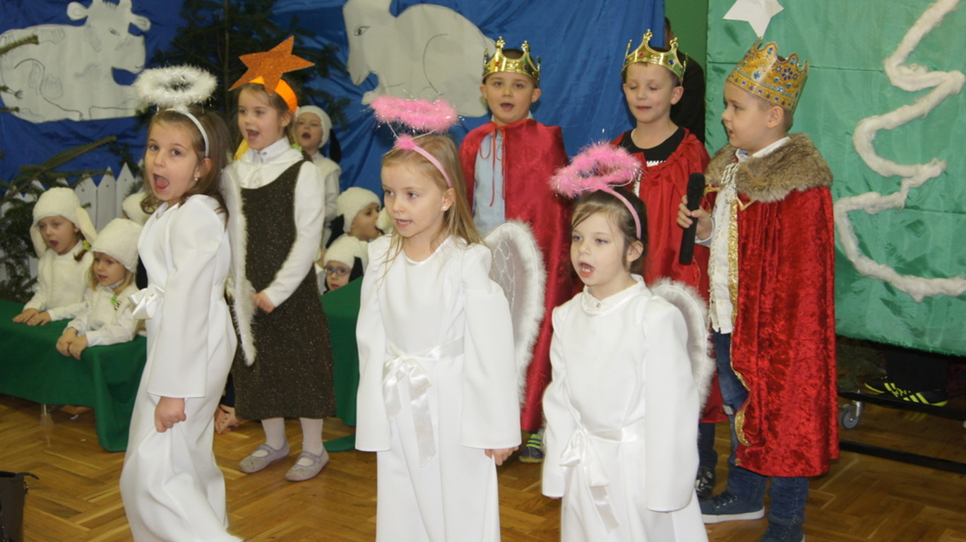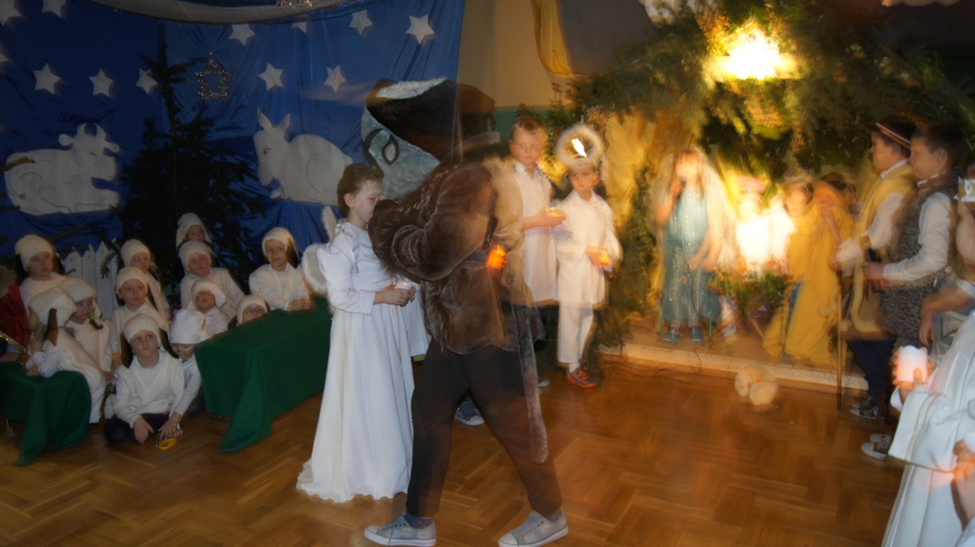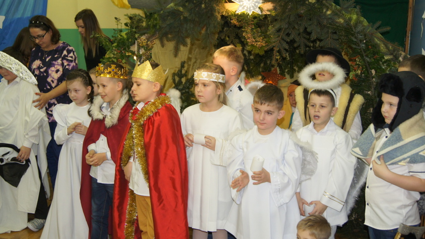 Podczas tegorocznych jasełek, uczniowie naszej szkoły wraz z przedszkolakami Punktu Przedszkolnego „Miś” w żywiołowy sposób wyśpiewali i odtańczyli radosną tajemnicę Bożego Narodzenia. Dzieci zachęciły wszystkich zaproszonych gości oraz kolegów i koleżanki do przeżywania tej magicznej, jedynej nocy w roku. Podczas przedstawienia jasełkowego, nawet zwierzęta przemówiły ludzkim głosem, by obwieścić radosną nowinę. Na pierwszy plan wysunęły się postacie aniołów oraz baranków odegranych przez przedszkolaków, na scenie pojawili się także Trzej Królowie, pasterze, Archanioł Gabriel, Józef, Maryja z Dzieciątkiem. Uczennice klasy IV i V odegrały kolędy na keyboardzie, a Pan Dyrektor na akordeonie. Doskonałym uzupełnieniem tekstu mówionego była muzyka, nocny nastrój poszczególnych scen oraz piosenki dla dzieci i pastorałki.