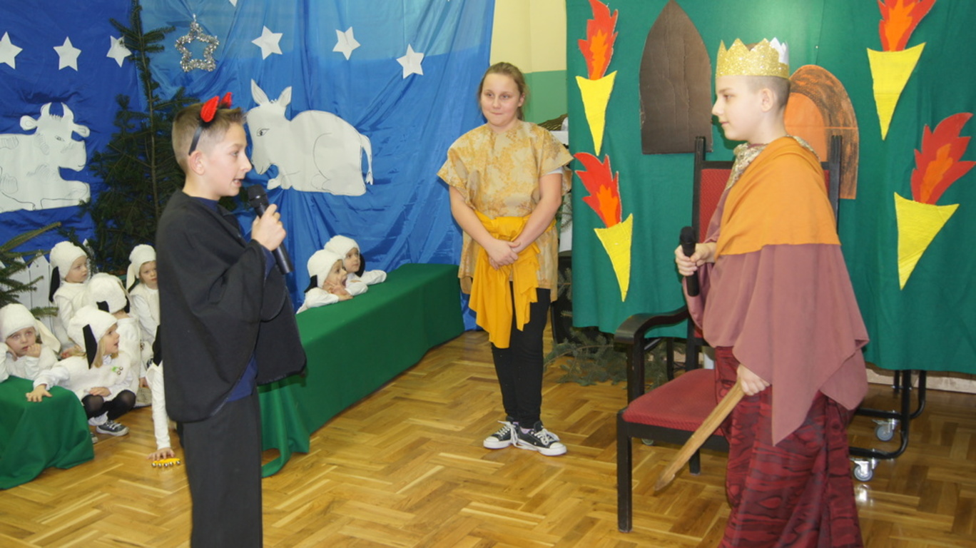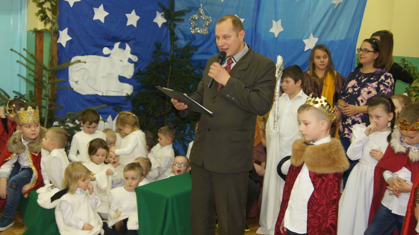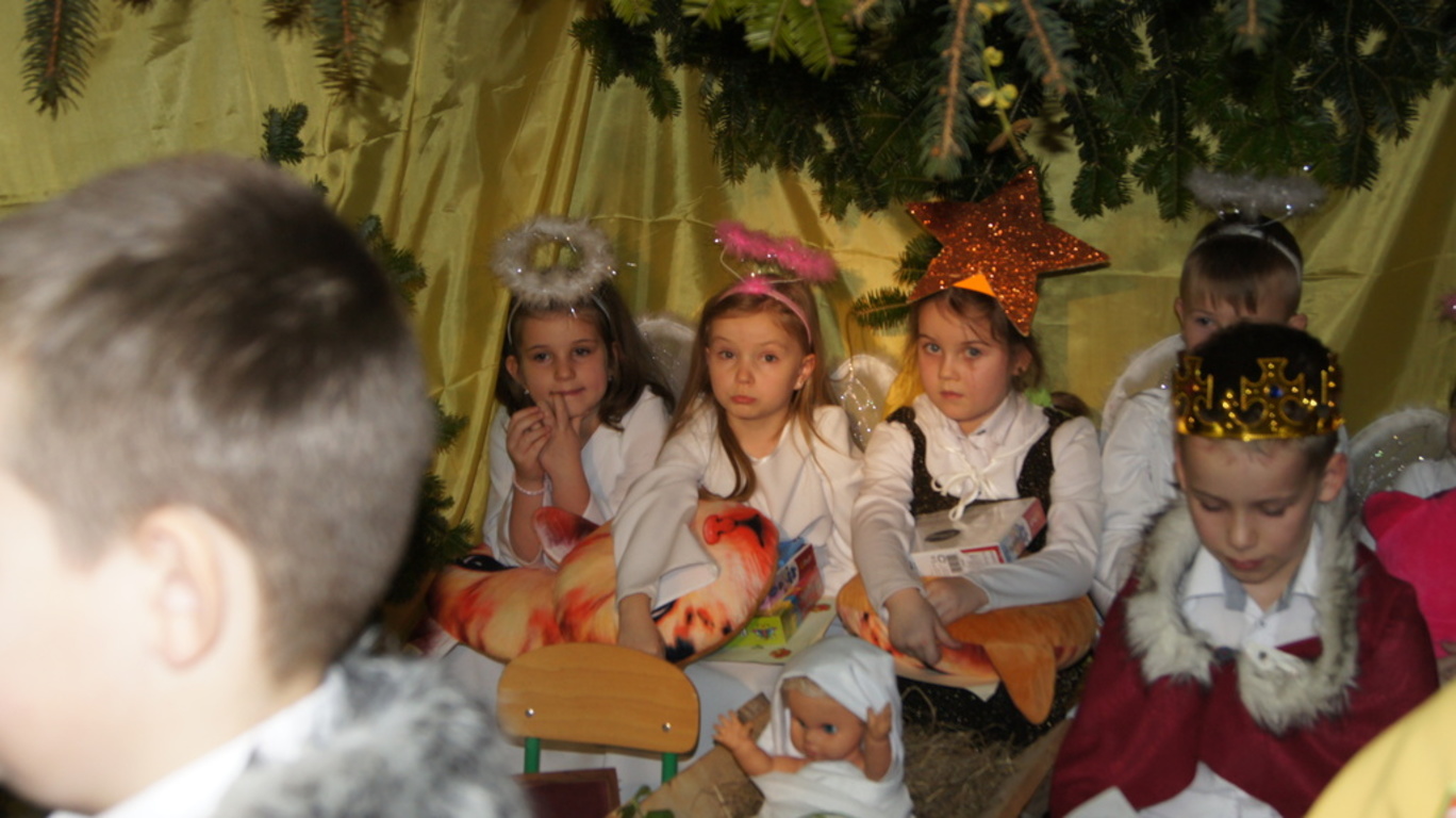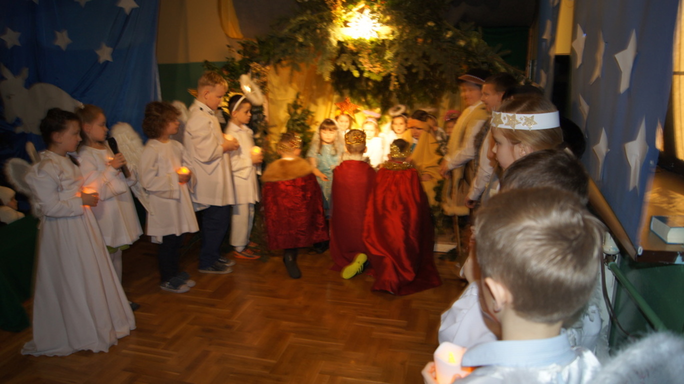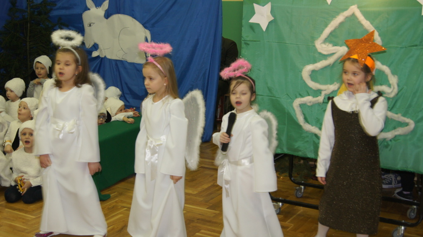 Podczas tegorocznych jasełek, uczniowie naszej szkoły wraz z przedszkolakami Punktu Przedszkolnego „Miś” w żywiołowy sposób wyśpiewali i odtańczyli radosną tajemnicę Bożego Narodzenia. Dzieci zachęciły wszystkich zaproszonych gości oraz kolegów i koleżanki do przeżywania tej magicznej, jedynej nocy w roku. Podczas przedstawienia jasełkowego, nawet zwierzęta przemówiły ludzkim głosem, by obwieścić radosną nowinę. Na pierwszy plan wysunęły się postacie aniołów oraz baranków odegranych przez przedszkolaków, na scenie pojawili się także Trzej Królowie, pasterze, Archanioł Gabriel, Józef, Maryja z Dzieciątkiem. Uczennice klasy IV i V odegrały kolędy na keyboardzie, a Pan Dyrektor na akordeonie. Doskonałym uzupełnieniem tekstu mówionego była muzyka, nocny nastrój poszczególnych scen oraz piosenki dla dzieci i pastorałki.