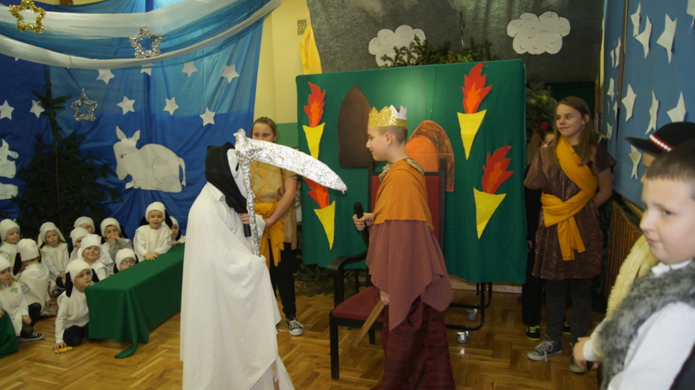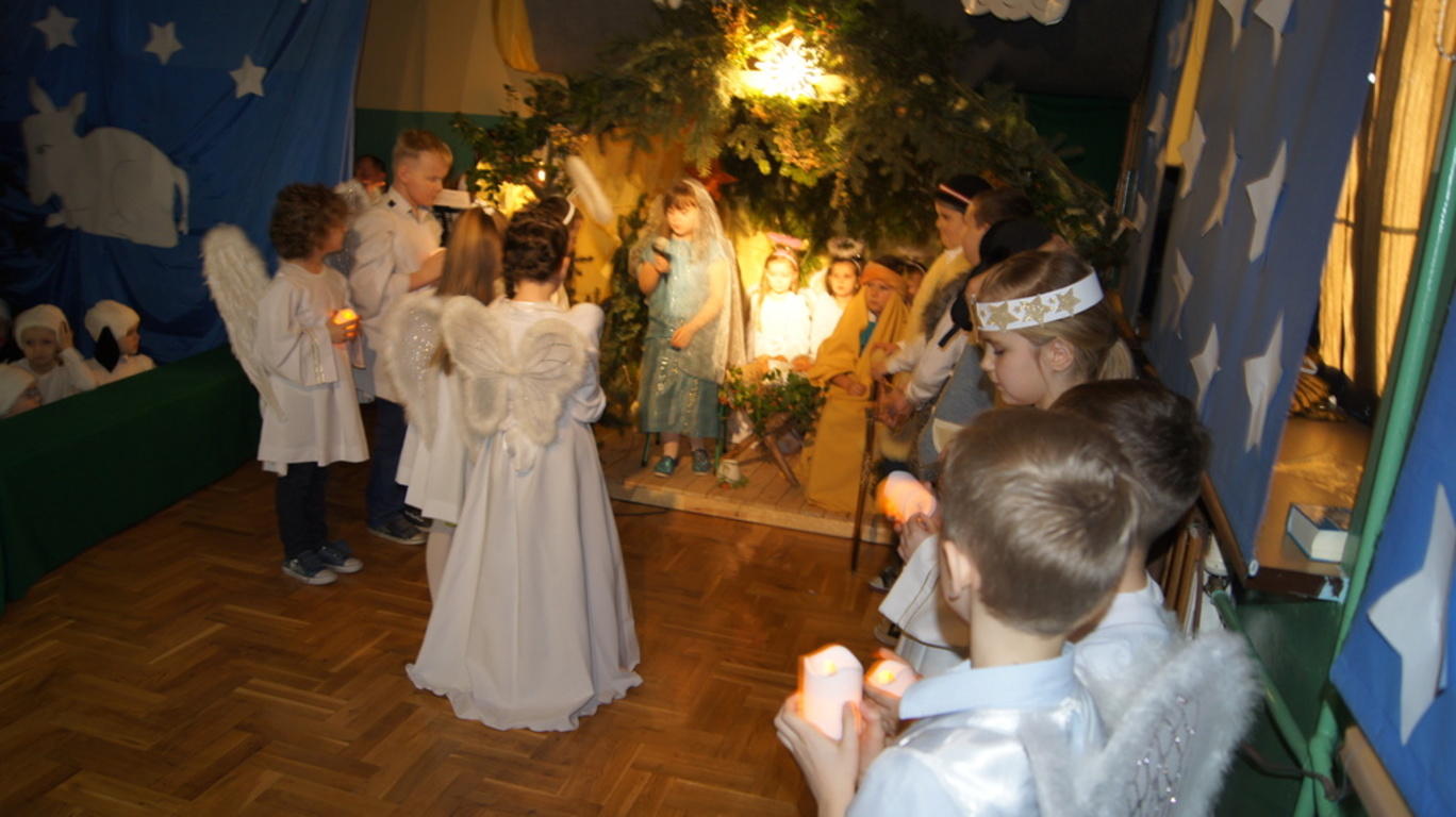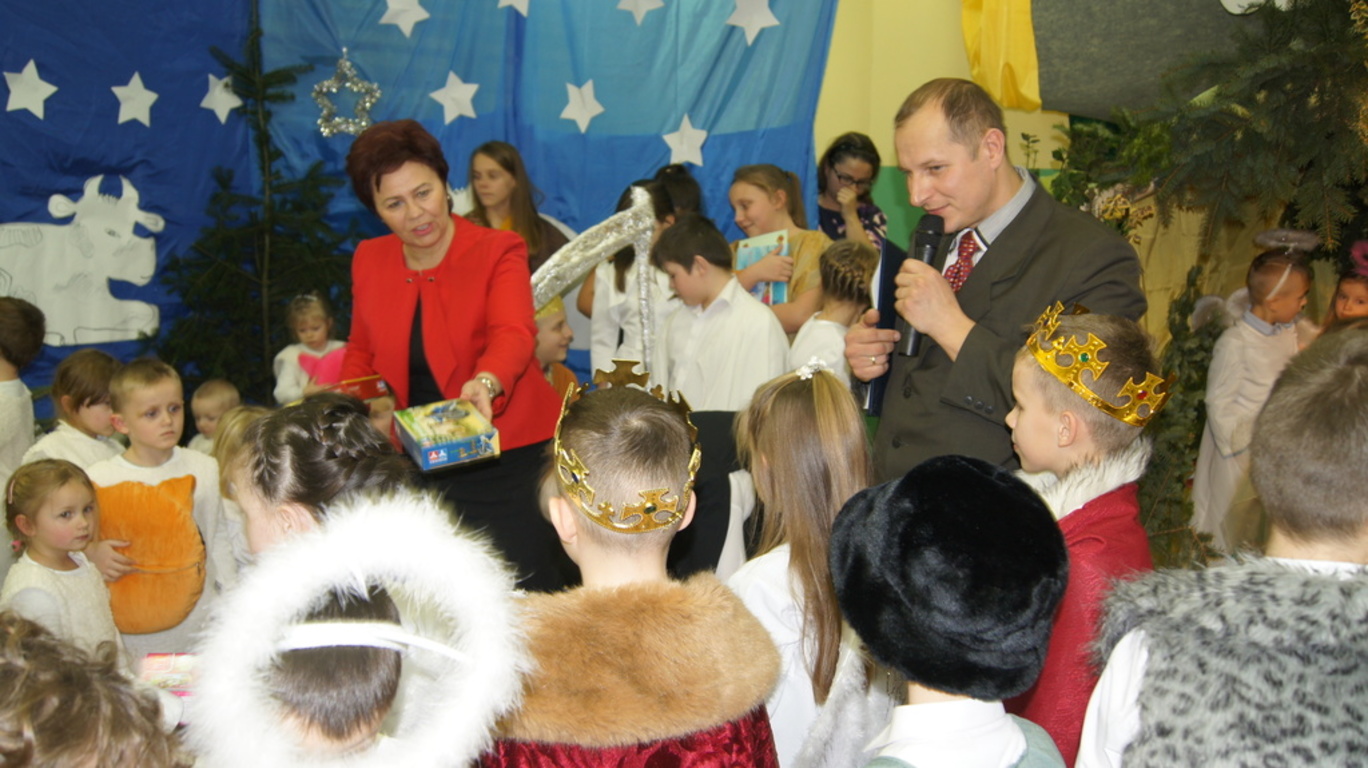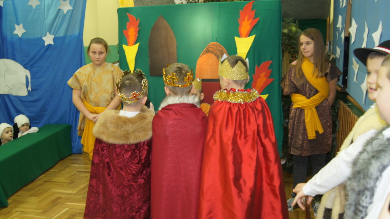 Podczas tegorocznych jasełek, uczniowie naszej szkoły wraz z przedszkolakami Punktu Przedszkolnego „Miś” w żywiołowy sposób wyśpiewali i odtańczyli radosną tajemnicę Bożego Narodzenia. Dzieci zachęciły wszystkich zaproszonych gości oraz kolegów i koleżanki do przeżywania tej magicznej, jedynej nocy w roku. Podczas przedstawienia jasełkowego, nawet zwierzęta przemówiły ludzkim głosem, by obwieścić radosną nowinę. Na pierwszy plan wysunęły się postacie aniołów oraz baranków odegranych przez przedszkolaków, na scenie pojawili się także Trzej Królowie, pasterze, Archanioł Gabriel, Józef, Maryja z Dzieciątkiem. Uczennice klasy IV i V odegrały kolędy na keyboardzie, a Pan Dyrektor na akordeonie. Doskonałym uzupełnieniem tekstu mówionego była muzyka, nocny nastrój poszczególnych scen oraz piosenki dla dzieci i pastorałki.