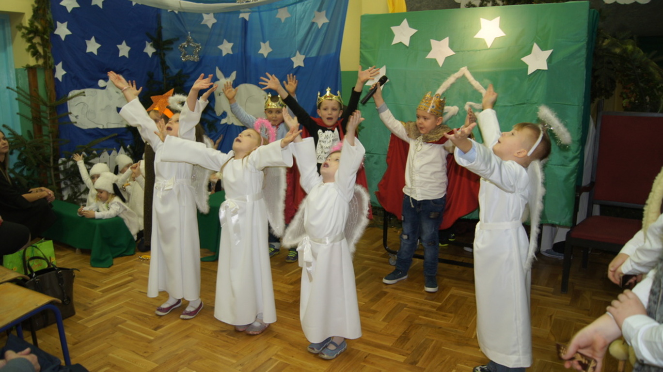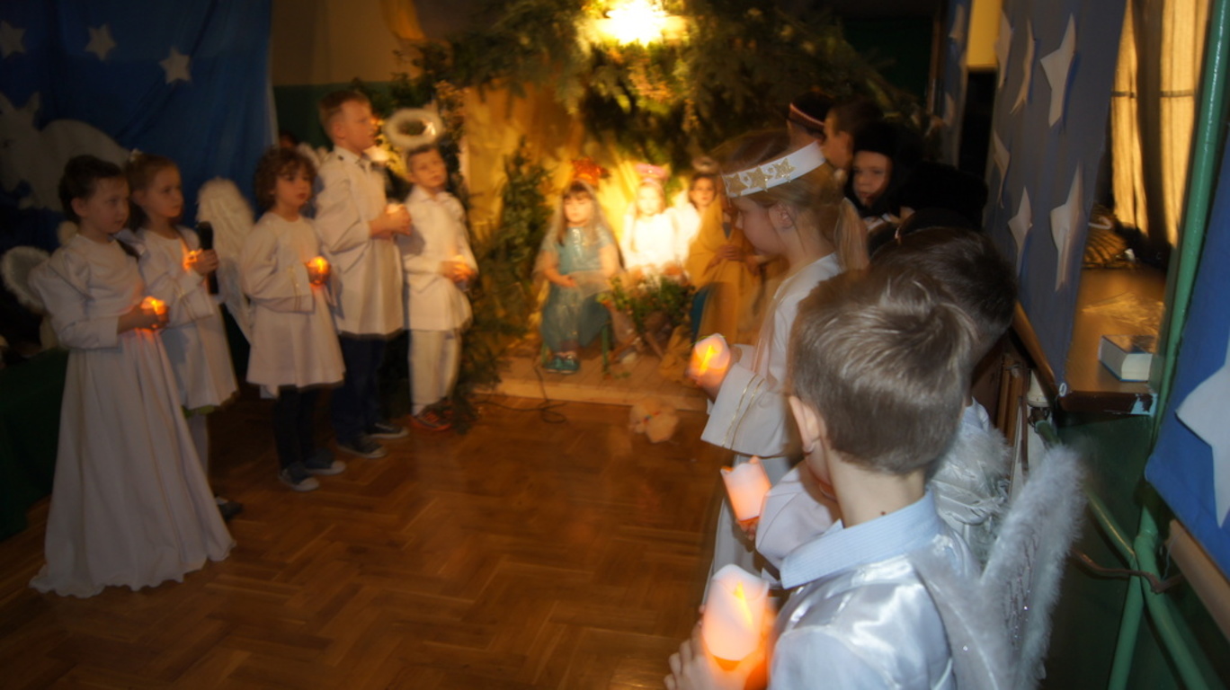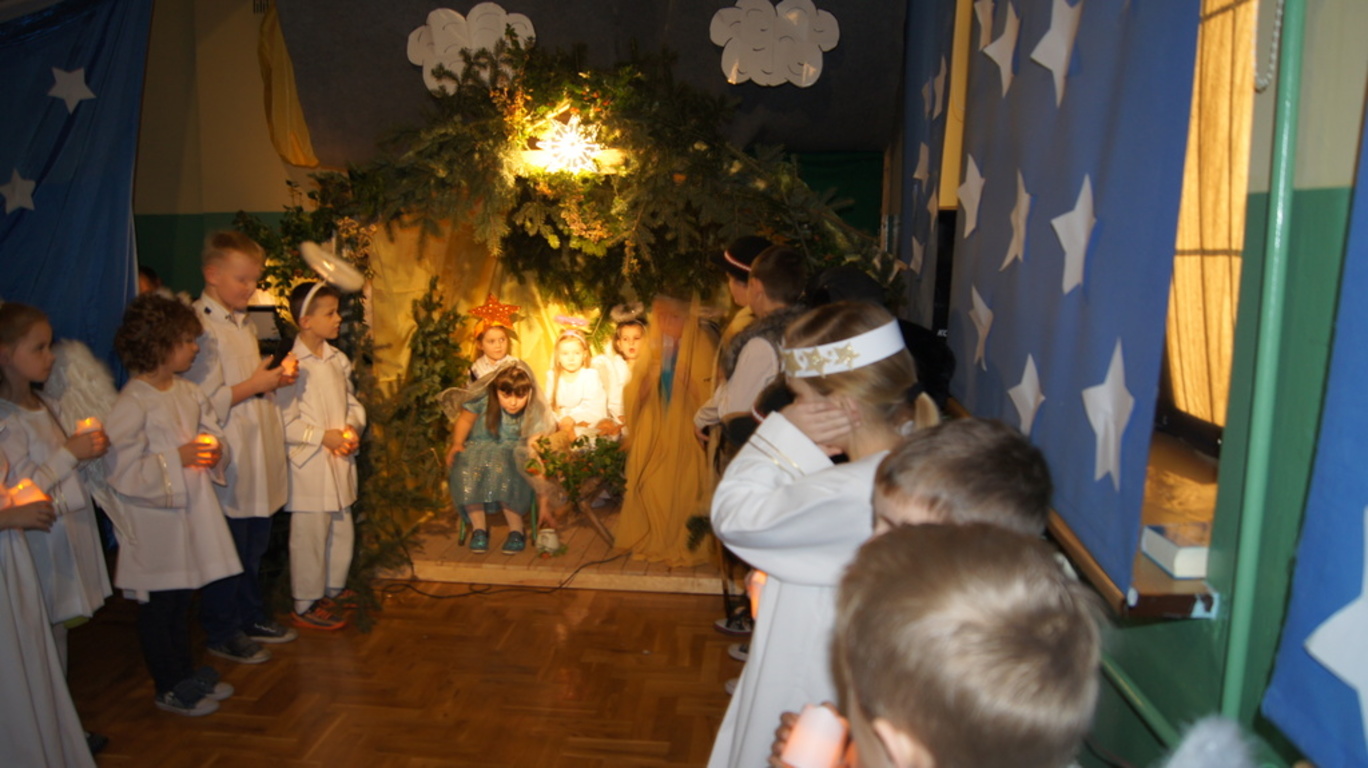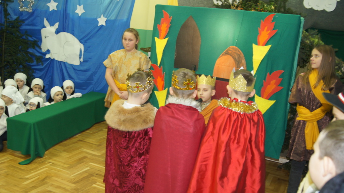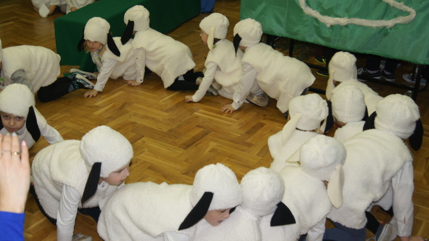 Podczas tegorocznych jasełek, uczniowie naszej szkoły wraz z przedszkolakami Punktu Przedszkolnego „Miś” w żywiołowy sposób wyśpiewali i odtańczyli radosną tajemnicę Bożego Narodzenia. Dzieci zachęciły wszystkich zaproszonych gości oraz kolegów i koleżanki do przeżywania tej magicznej, jedynej nocy w roku. Podczas przedstawienia jasełkowego, nawet zwierzęta przemówiły ludzkim głosem, by obwieścić radosną nowinę. Na pierwszy plan wysunęły się postacie aniołów oraz baranków odegranych przez przedszkolaków, na scenie pojawili się także Trzej Królowie, pasterze, Archanioł Gabriel, Józef, Maryja z Dzieciątkiem. Uczennice klasy IV i V odegrały kolędy na keyboardzie, a Pan Dyrektor na akordeonie. Doskonałym uzupełnieniem tekstu mówionego była muzyka, nocny nastrój poszczególnych scen oraz piosenki dla dzieci i pastorałki.