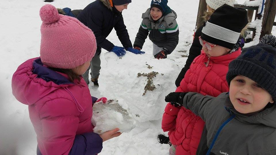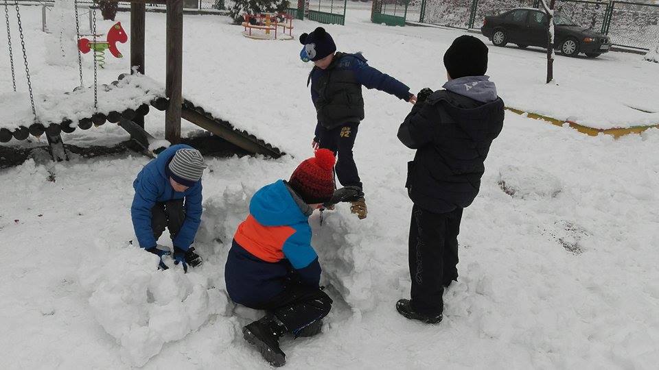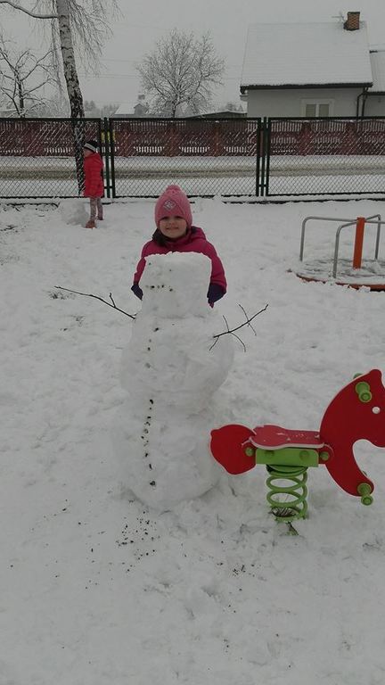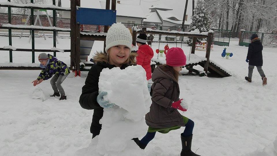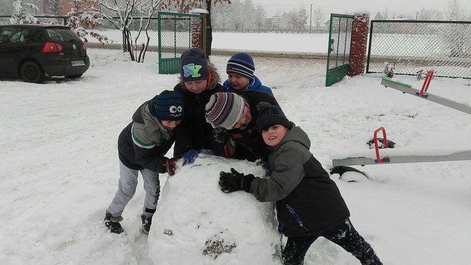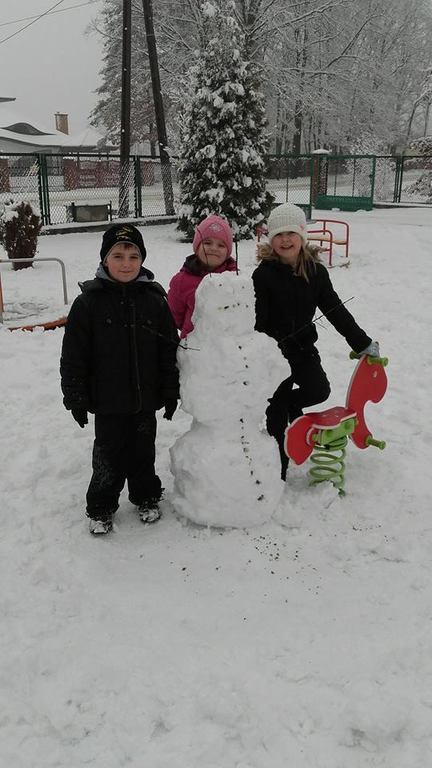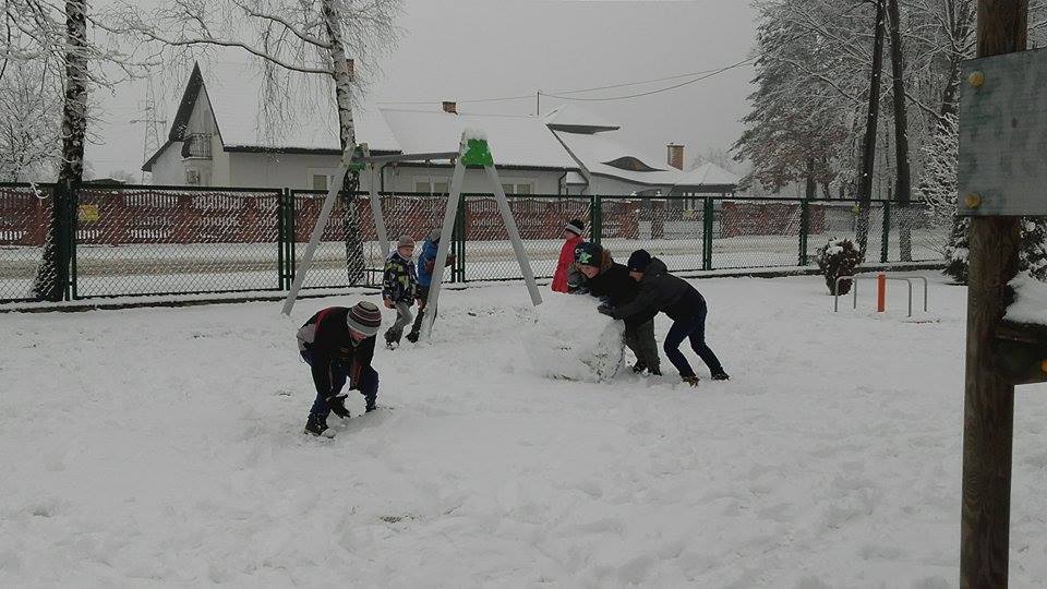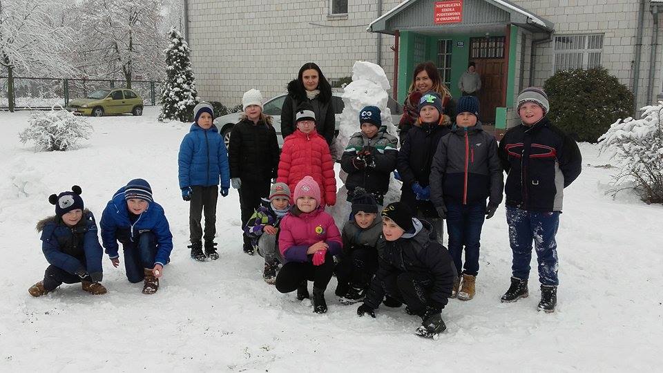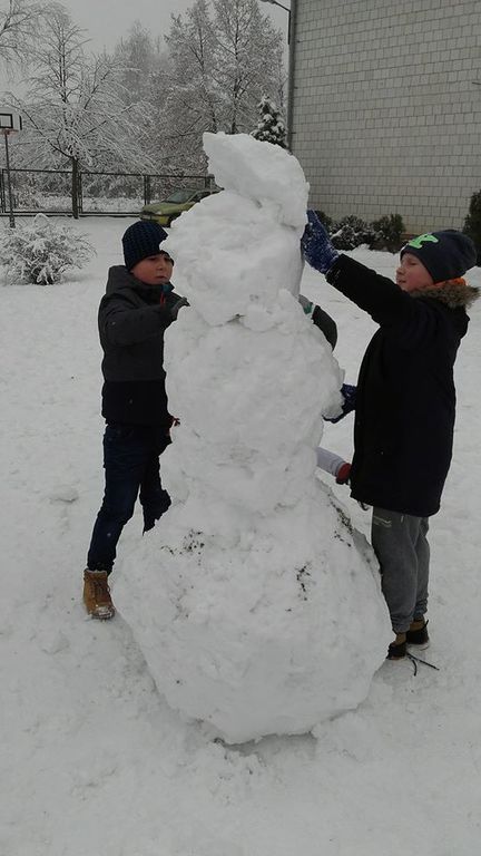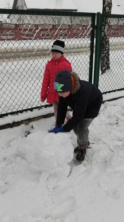 Uczniowie klas I – III korzystając z zimowej aury, wyszli lepić bałwany. Z zapałem toczyli śniegowe kule. Wspólnymi siłami umieszczali jedną na drugiej. Szkolny plac zabaw zapełnił się bałwankami. Zajęcia wychowania fizycznego na świeżym powietrzu bardzo się dzieciom podobały. Wszyscy bawili się wyśmienicie.