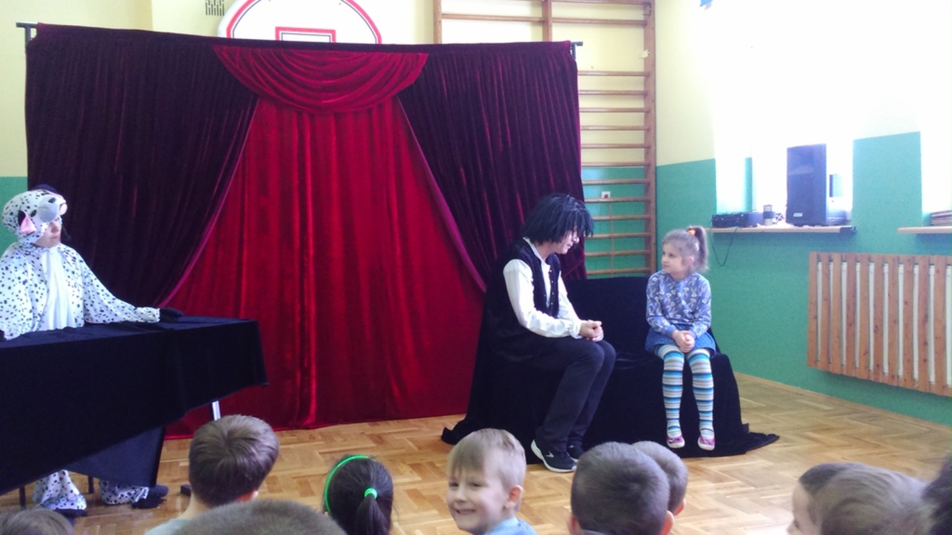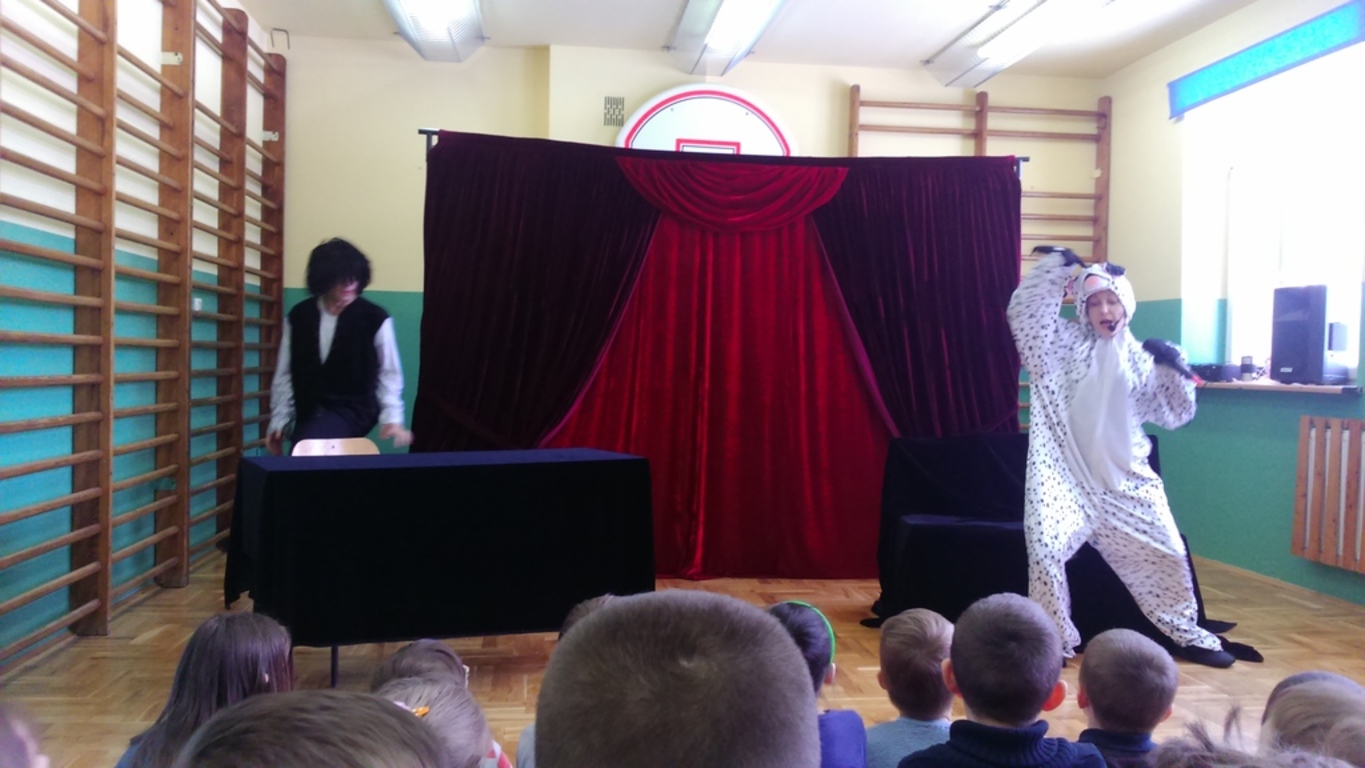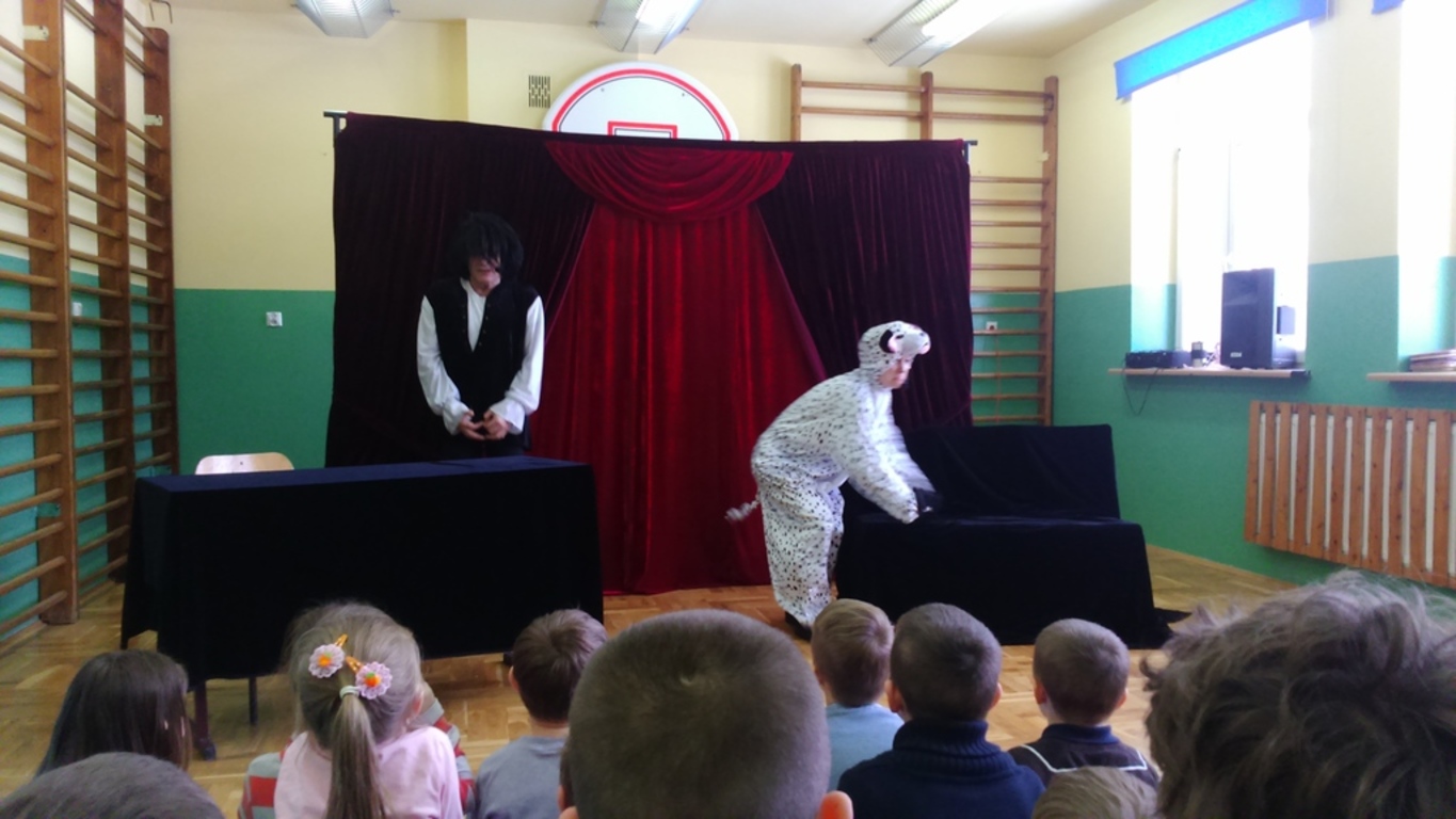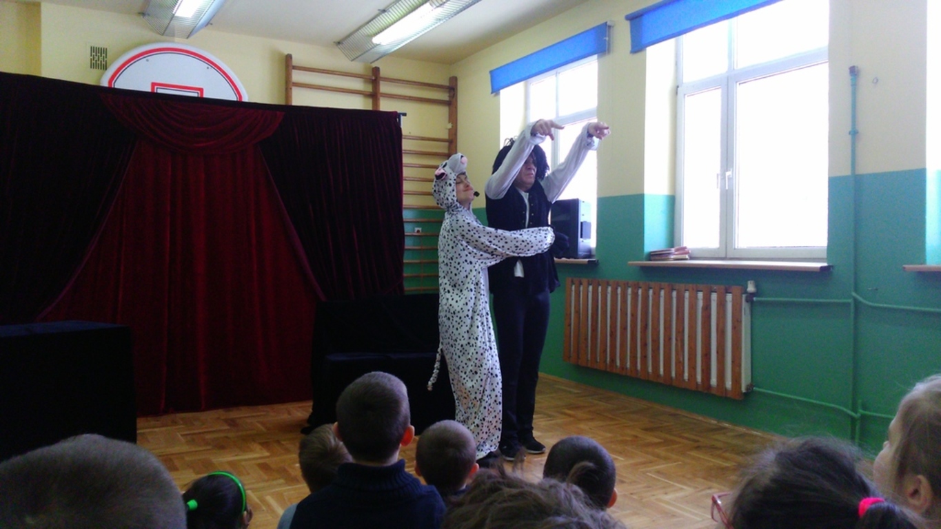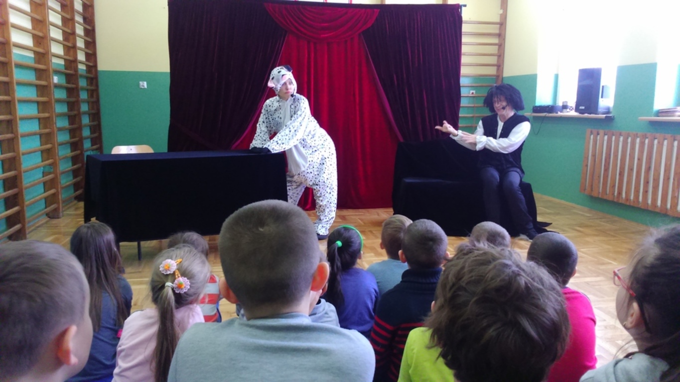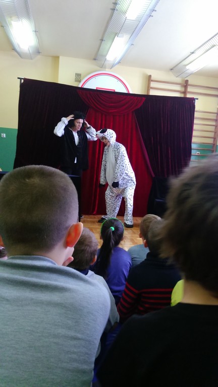 Dnia 7 lutego gościliśmy w naszej szkole aktorów teatru „Kurtyna”. Mieliśmy okazję obejrzeć zabawny, poruszający i mądry spektakl, pełen humoru i piosenek, opowiadający historię przyjaźni małego chłopca, jego mamy i wiernego psa. Aktorzy przedstawili historię, która w istocie jest uroczą teatralną lekcją, tematycznie skupioną na realizacji najważniejszych działań edukacyjnych i profilaktycznych. Spektakl obejrzeli uczniowie klas 0-VI wraz ze swoimi wychowawcami. Opowiadał on o rozbrykanym i czupurnym Dominiku, który chciał posiadać w domu żywe zwierzątko. W splocie wydarzeń główny bohater przygarnia do domu porzuconego przez właścicieli psa Reksia. Szybko uczy się, czym jest odpowiedzialność oraz, że dbanie i opieka nad zwierzętami nie kończy się wtedy, gdy już się znudzą. Dominik doskonale rozumie mowę psa. I chociaż z początku chłopcu bardzo nie podoba się to, co Reksio ma do powiedzenia o swoim nowym właścicielu i jego zachowaniu, to zaskakujące wydarzenia pozwalają Dominikowi odkryć potęgę dobra i mądrości oraz zalety odpowiedzialności.