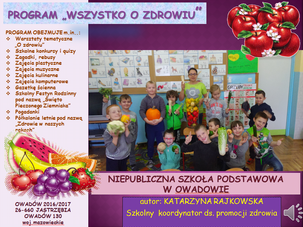Autorski program pod nazwą "Wszystko o zdrowiu", stworzony prze Panią K. Rajkowską miał na celu podniesienie, jakości działań towarzyszących programowi „Owoce i warzywa w szkole”, propagowanie zasad zdrowego żywienia i kształtowanie prawidłowych nawyków żywieniowych wśród dzieci uczęszczających do szkół podstawowych, promowanie oraz informowanie o produktach rolnych i żywnościowych, metodach ich produkcji, a także systemach, jakości produktów rolnych i żywnościowych.