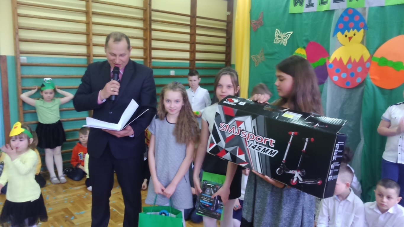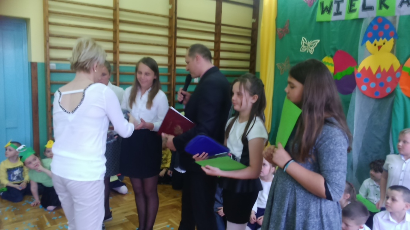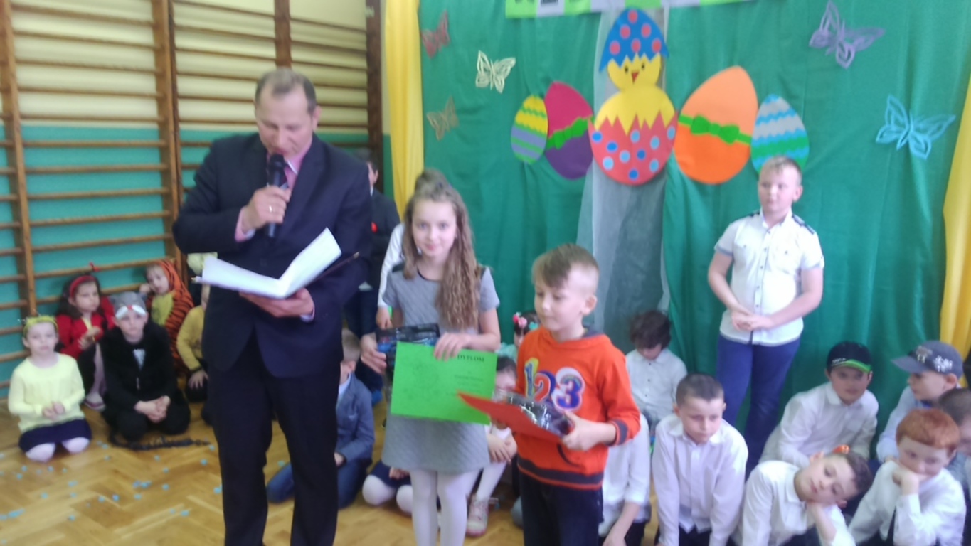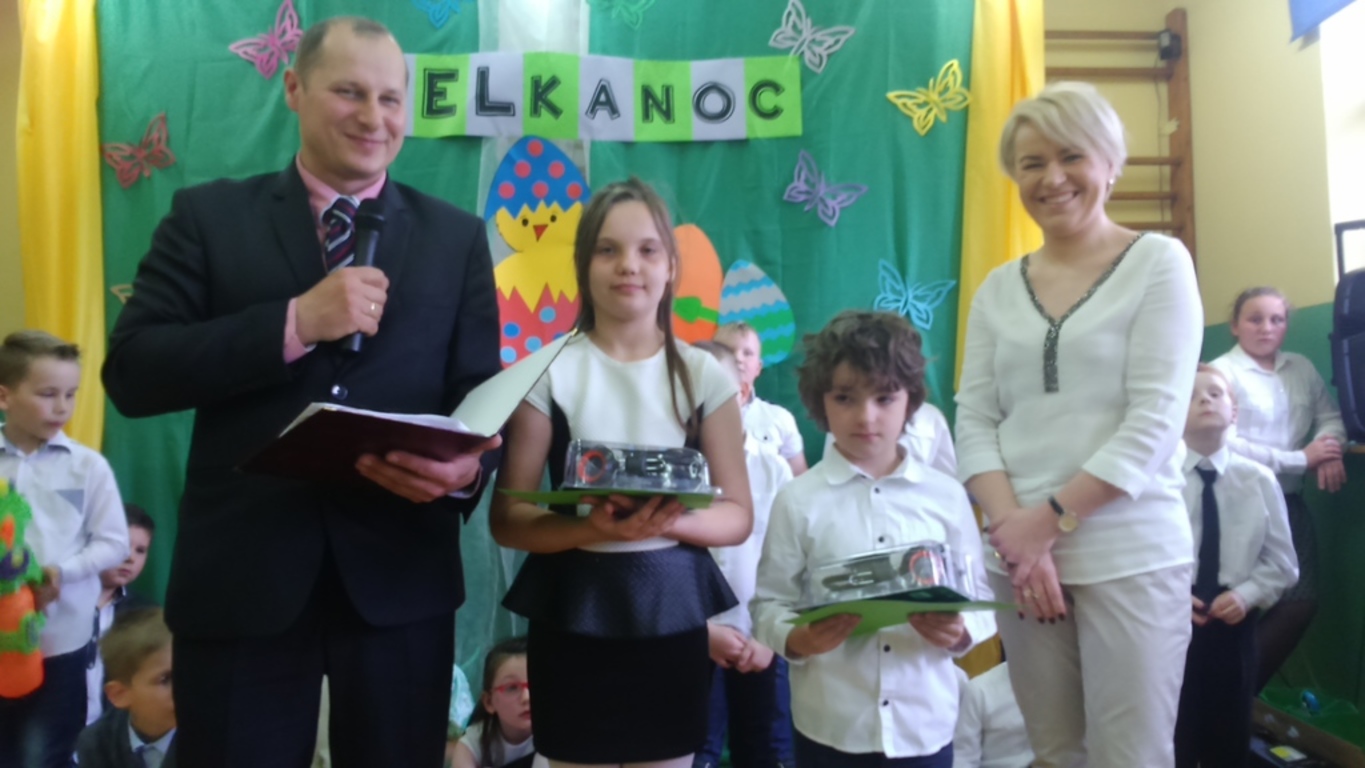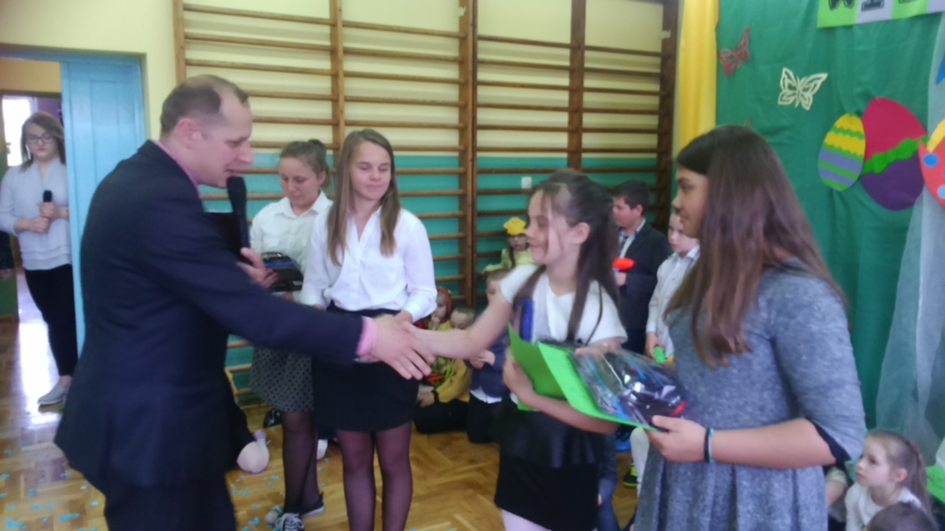 Przy okazji apelu wielkanocnego, zostały wręczone nagrody i dyplomy w konkursach na „Odkrywcę baśni” - I nagroda dla Julii Tomaszewskiej za najpiękniejszą baśń o rzece Wiśle i tytuł „Małego poety” - I nagroda dla Jana Kuśty za wiersz „Jako, czy kura?”. Konkursy literackie, zorganizowane zostały przez zespół humanistyczny, a w konkursie na „Najpiękniejszą palmę i pisankę” za I miejsca w obu kategoriach, nagrodę i dyplom wręczono Weronice Woźniak i Filipowi Szpakowi. Samorząd Szkolny odebrał rolki, hulajnogę i piłkę, uzyskane w ramach konkursu Agencji Rynku Rolnego za „Najlepszy program działań towarzyszących programowi owoce i warzywa w szkole”.