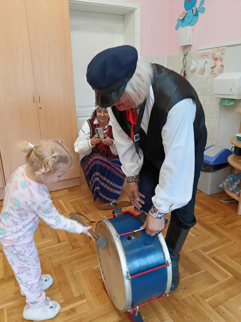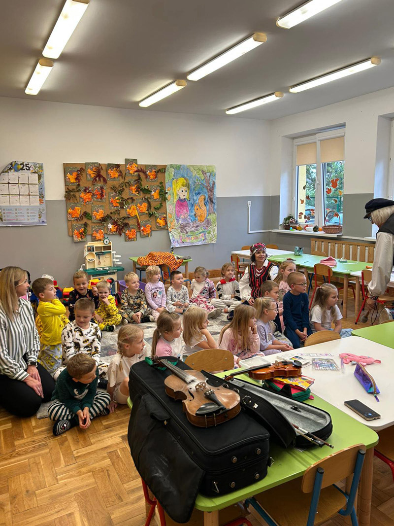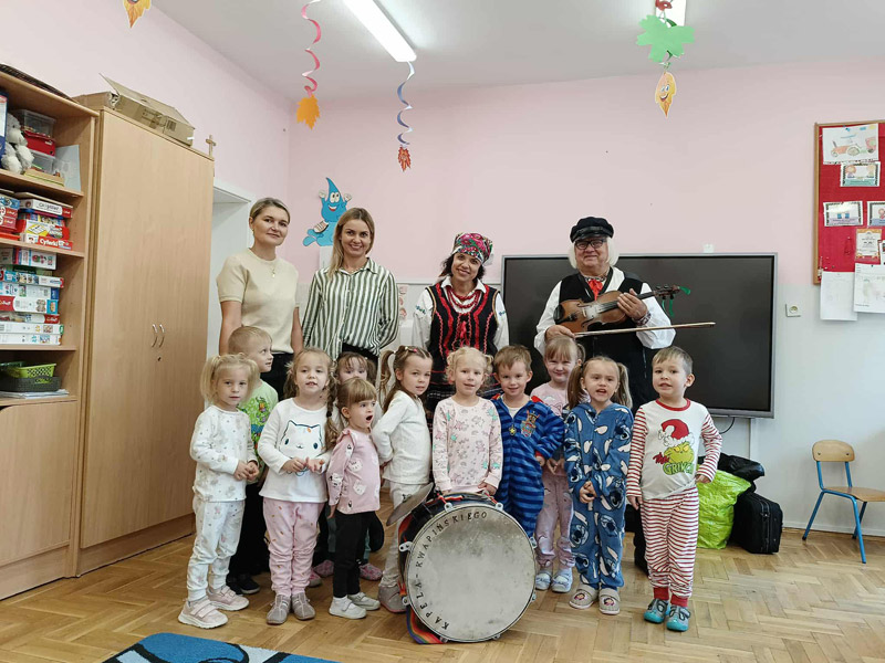 Dzieci wysłuchały opowieści pana Zdzisława o jego przygodzie z muzyką ludową, podziwiały grę na harmonijce, skrzypcach i saksofonie, a następnie same mogły spróbować swoich sił na różnych instrumentach.